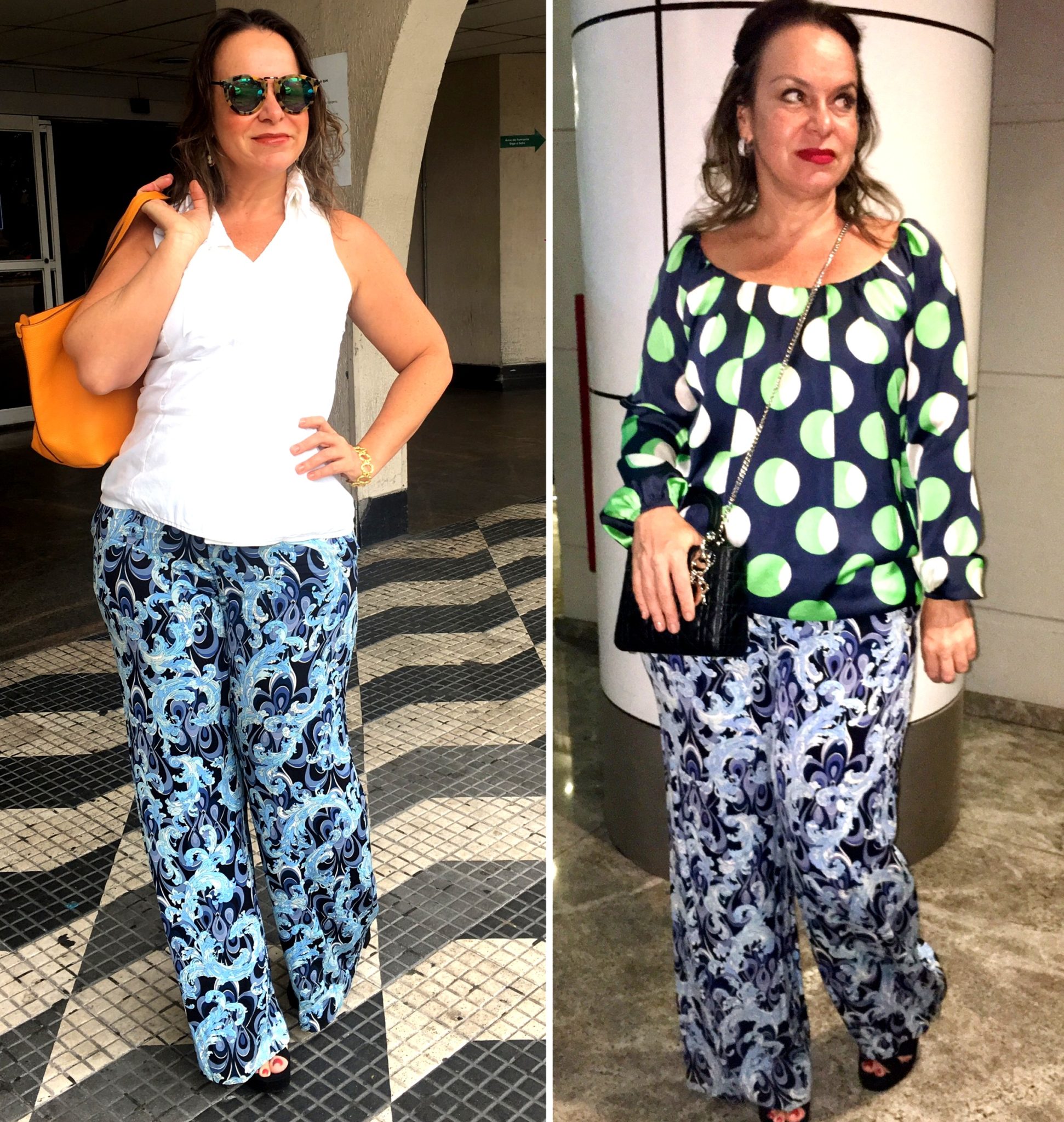 A mesma calça PUCCI azul saiu de dia e de noite.