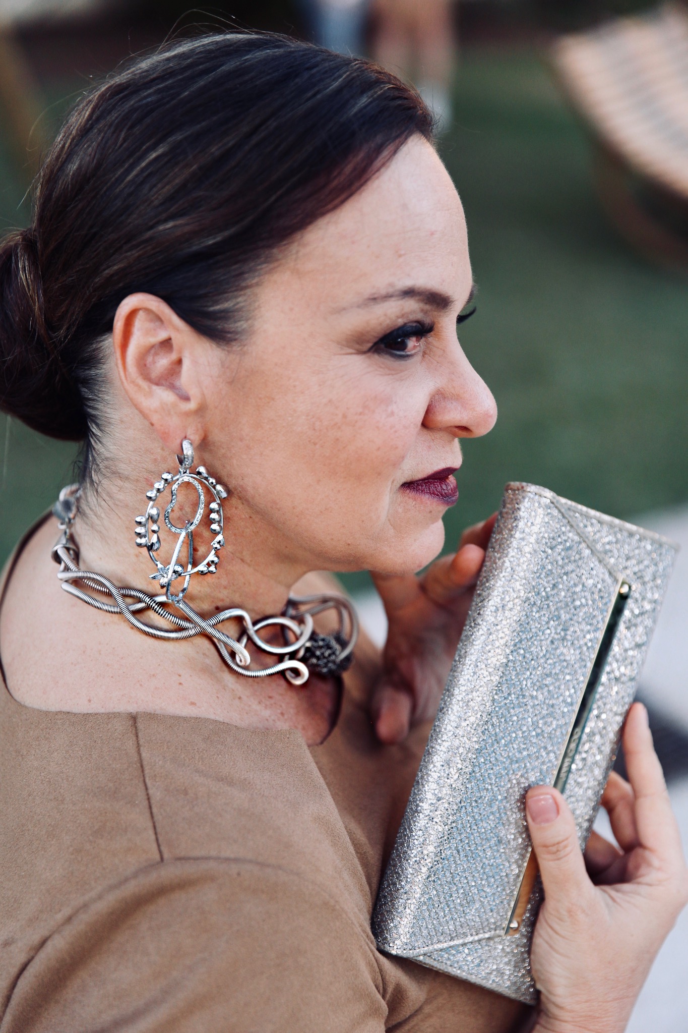 Usei acessórios interessantes. Não só a sandália era exatamente da cor da saia, como a clutch trazia o brilho para o brinco JOIAS PD. A ocasião me permitia ousar um pouco e dessa forma, usei esse colar bijoux em aço comprado em Paris a fim de que trouxesse essa “modernidade” ao look.