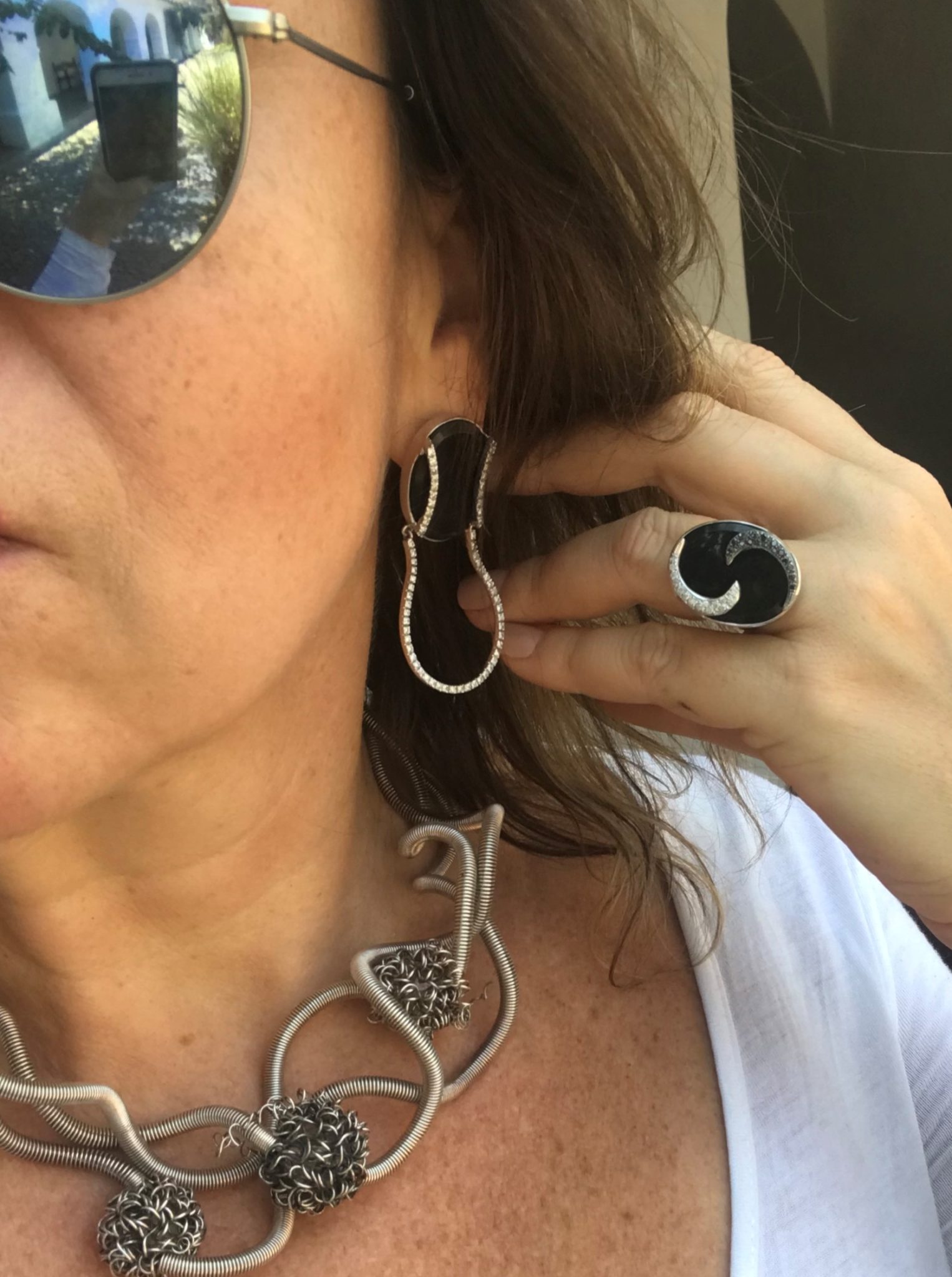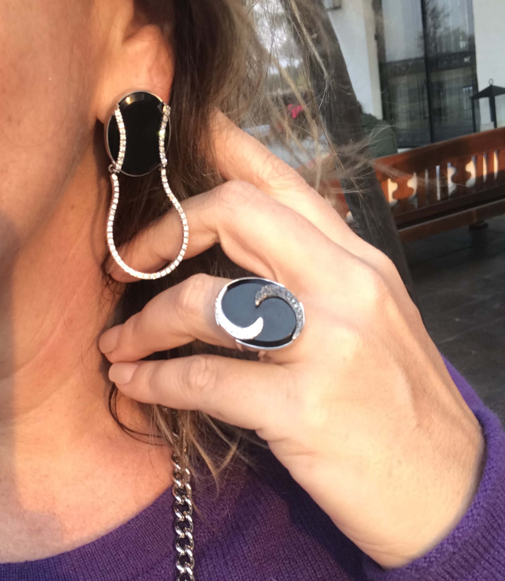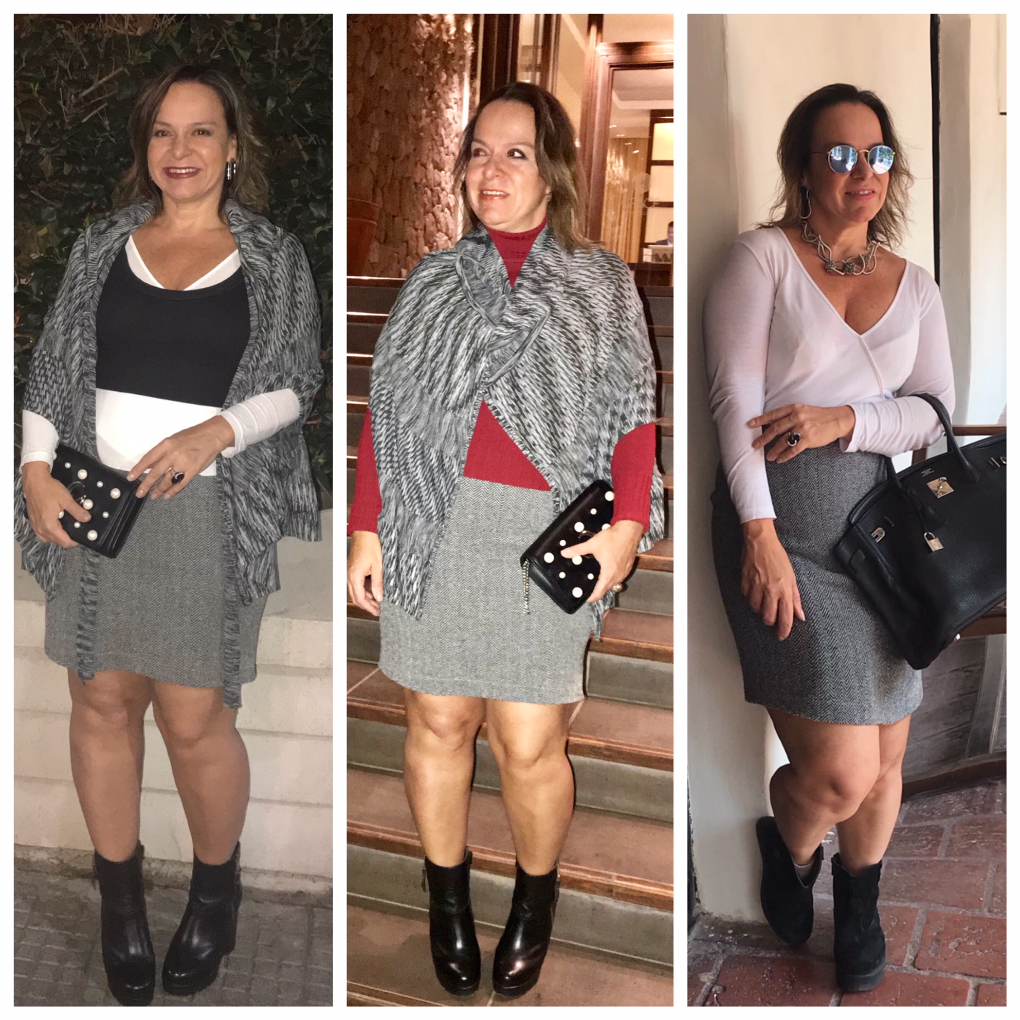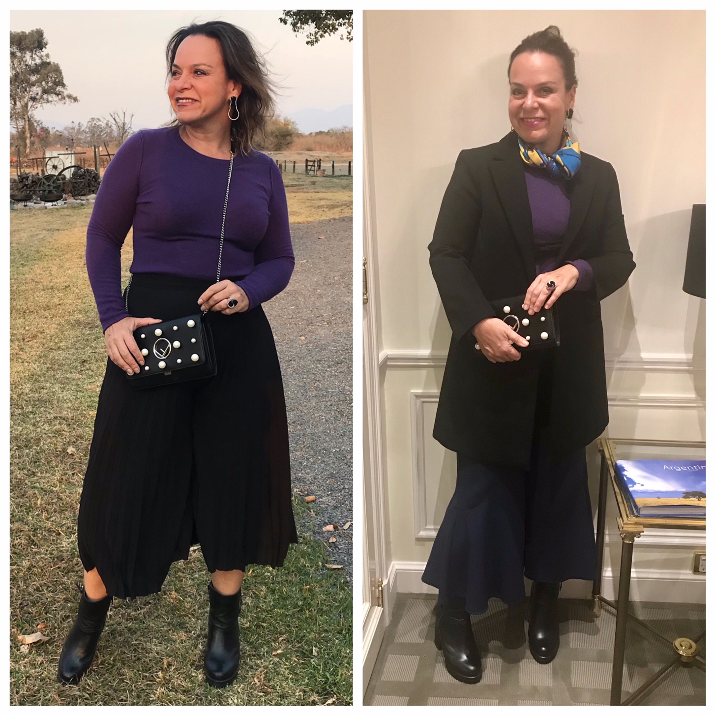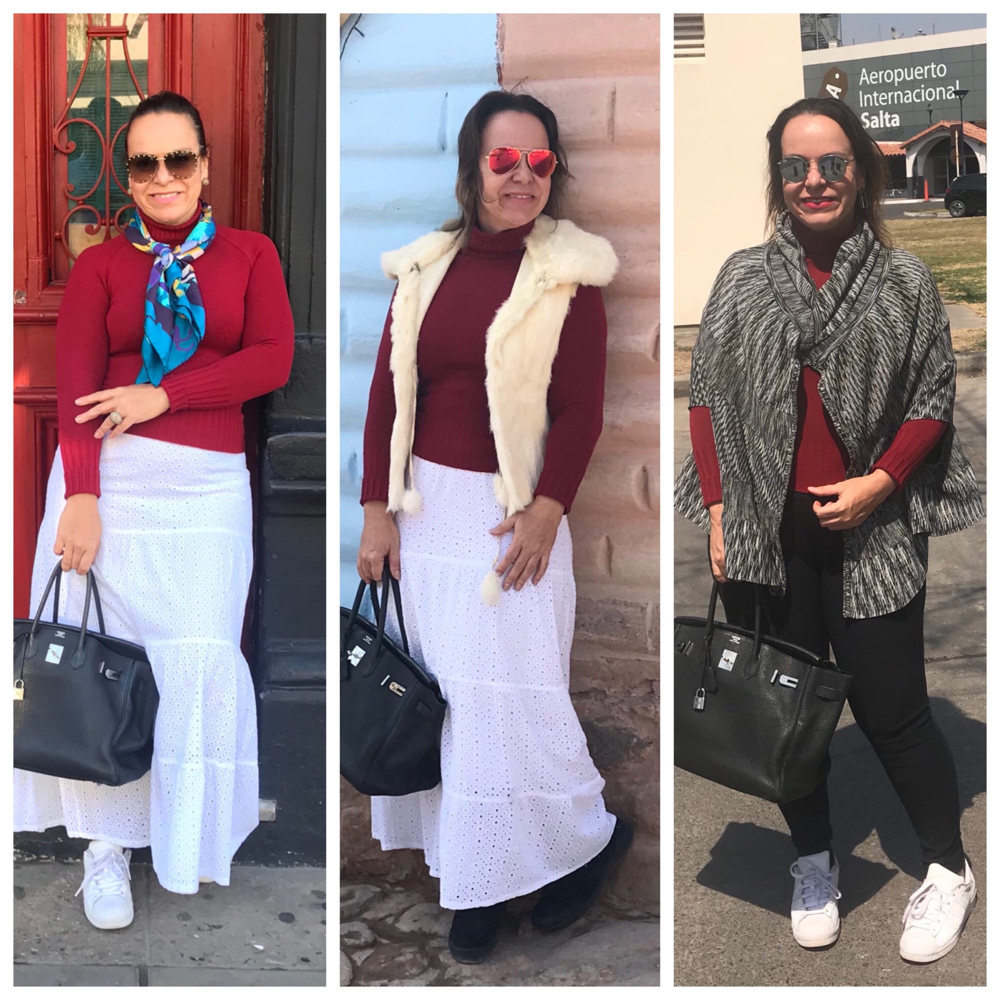 Um bom conjunto de joias em ônix é de grande valia, pois pode ser usado com muita versatilidade! A saia de pied poule também foi bastante repetida! Lembra da mala enxuta? Trocar de hotéis de 2 em 2 dias??? Pois é…
