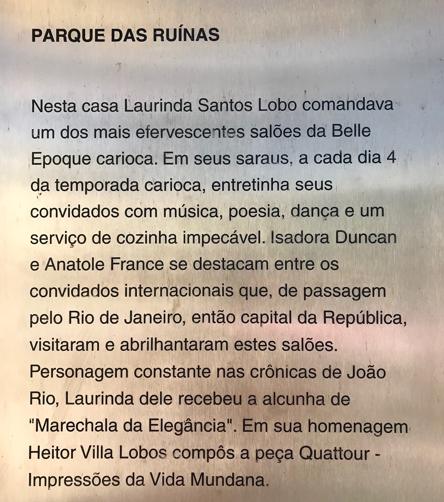 A descida leva até o PARQUE DAS RUÍNAS, local onde morou Laurinda Lobo na Belle Epoque carioca.