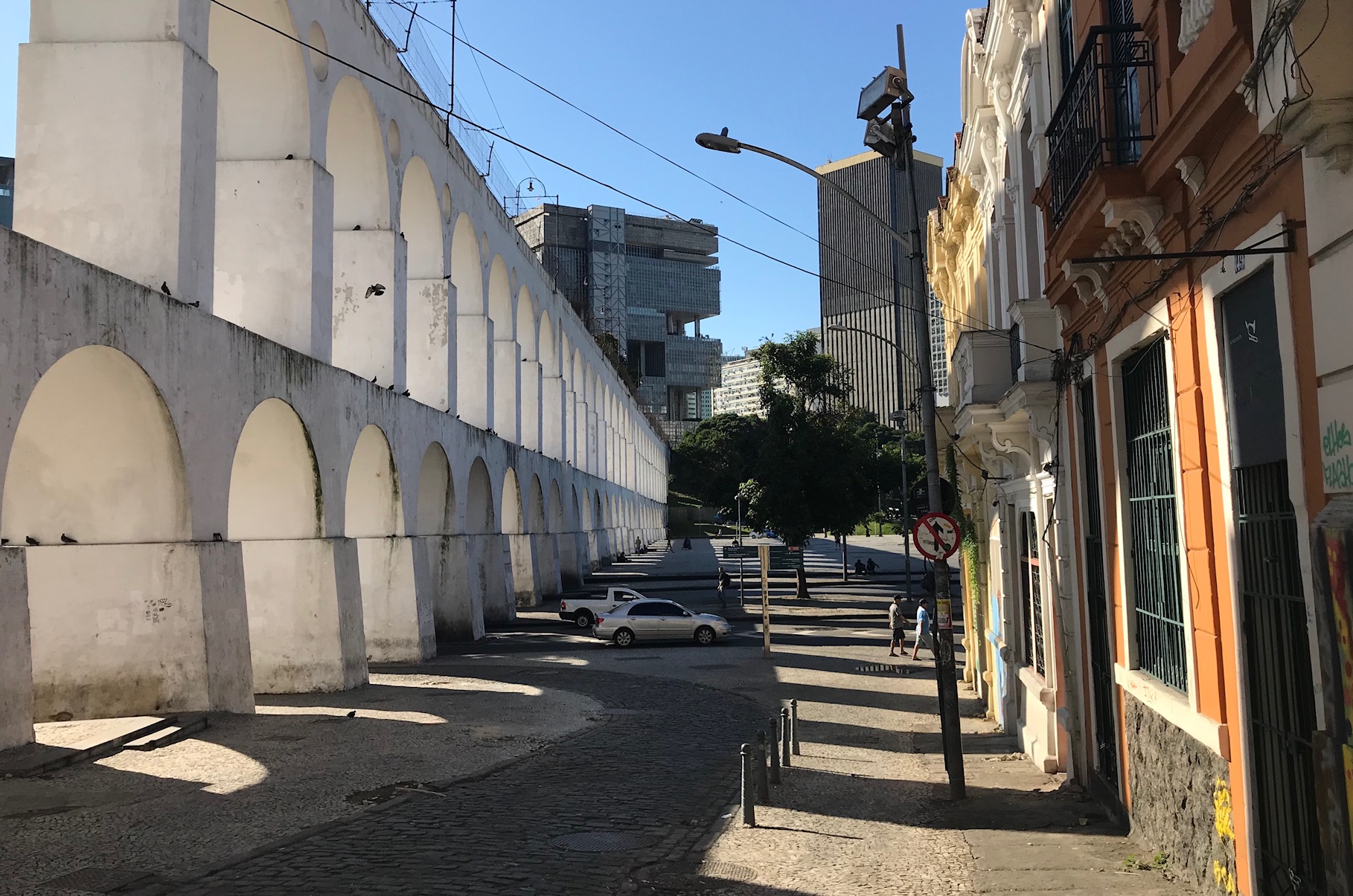 É uma caminhada totalmente descompromissada, conforme vocês estão vendo, um ponto distante do outro coisa de 15 minutos. De Santa Tereza até a Lapa é só descida, o que facilita tudo. Continuamos descendo e chegamos ao AQUEDUTO DA LAPA, essa obra ícone do Rio dos meados de 1600.