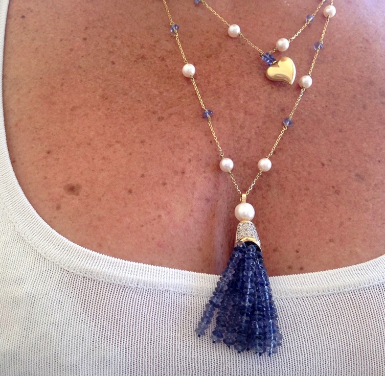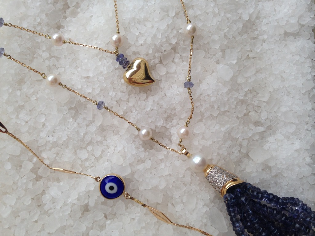 colar duplo em pérolas, brilhantes e iolitas —————- 10 x 470,00 = 4700,00