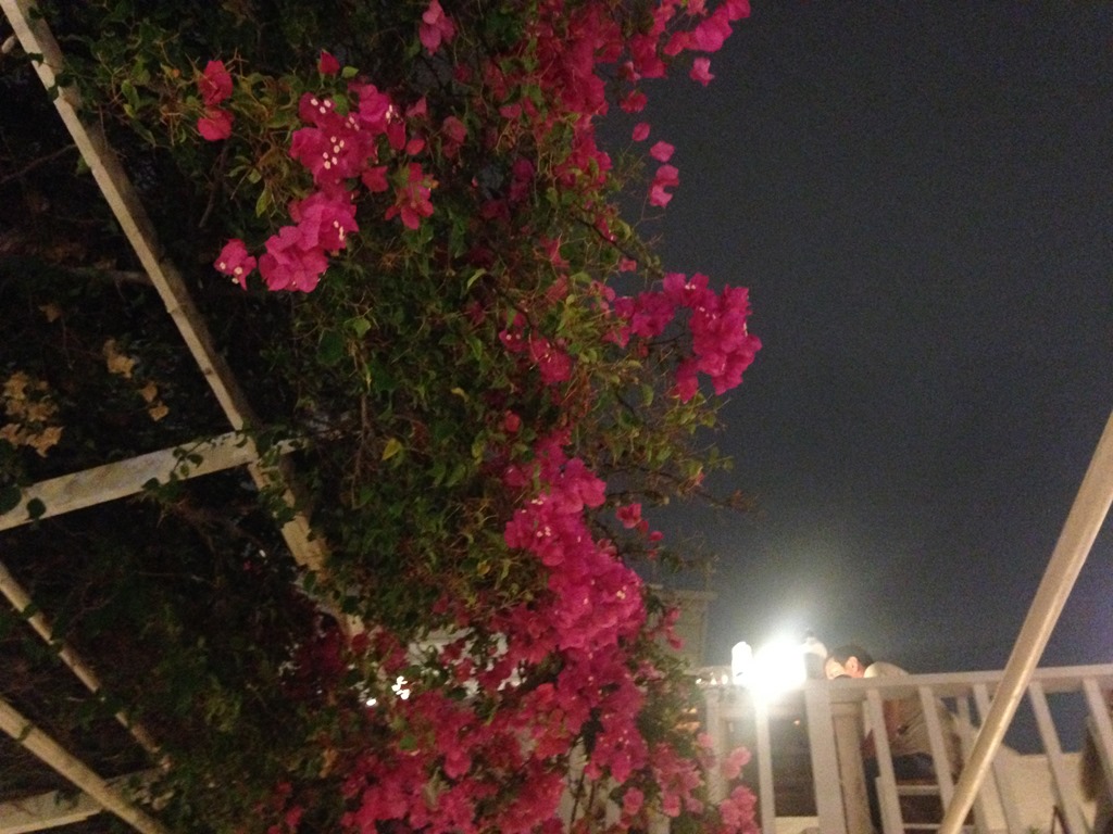 Assentamos na varanda sob bouganvilles, mas como eu disse, o terraço é o mais disputado se for na hora do por-do-sol . Como resistir aos doces tomatinhos de Santorini?