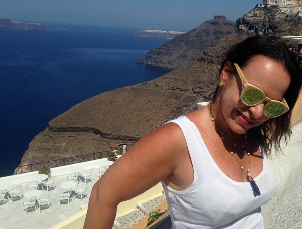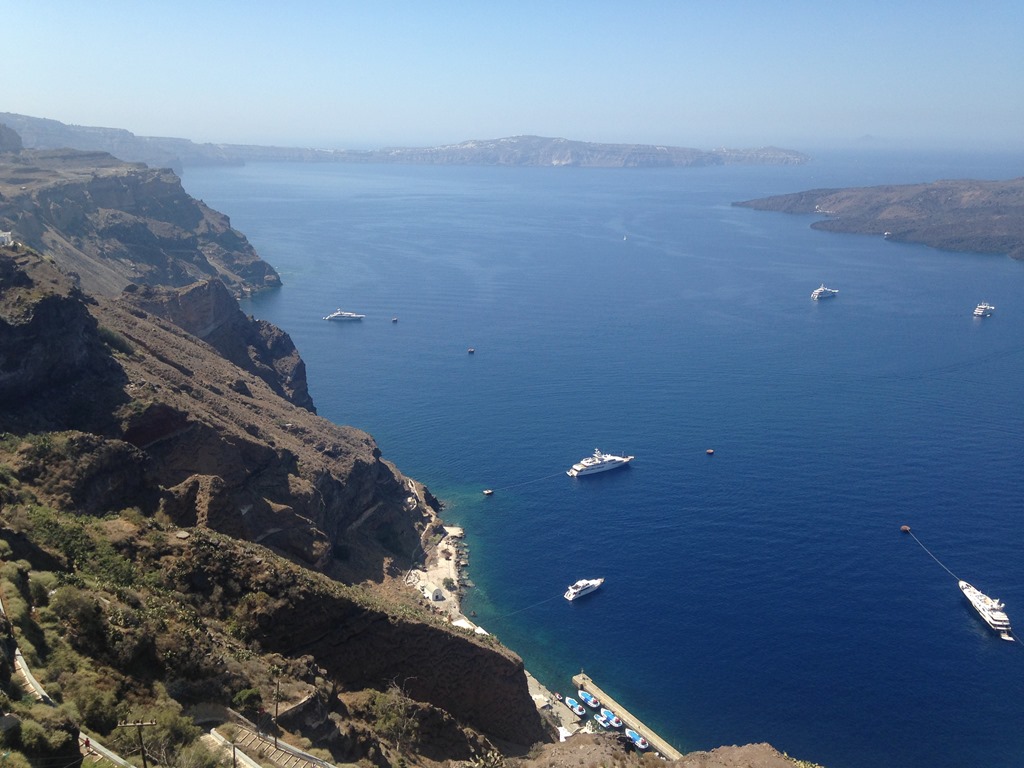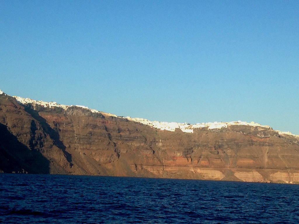 A Ilha de Santorini pertence ao arquipélago das Ilhas Cíclades (Cyclades) no mar Egeu a 200Km de Atenas. Fomos de ferry por opção.A ilha nada mais é que um dos cantos de um vulcão (ainda ativo) que teve sua maior e mais famosa erupção por volta de 1680 a.C.Essa erupção fez com que a ilha assumisse sua forma atual,e criou no meio dela, uma lagoa de água salgada. Dizem que essa erupção inspirou a lenda de Atlântida. E as catástrofes desencadeadas por sua erupção explicam também o tema bíblico das pragas do Egito. No cume do penhasco que beira a cratera foram erguidas as casinhas brancas, debruçadas sobre o mar e enfileiradas em vielas estreitas.