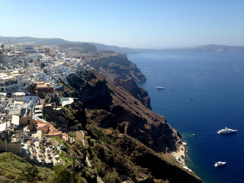 As vilas da ilha de Santorini são verdadeiros cartões postais: Casas caiadas de branco com tetos pintados de azul instaladas sobre a rocha vulcânica acinzentada e ao fundo o mar de um azul profundo. A capital da ilha é Fira, que tem hotéis e albergues, bares, comércio e vários restaurantes. No verão, sempre é necessário reservar em tudo e prepare-se para morrer de procurar vaga para estacionar. Alugamos um carro. Não dá para ficar sem. Lembrando que taxi é artigo de luxo nas ilhas.