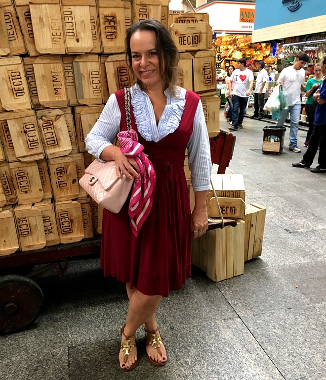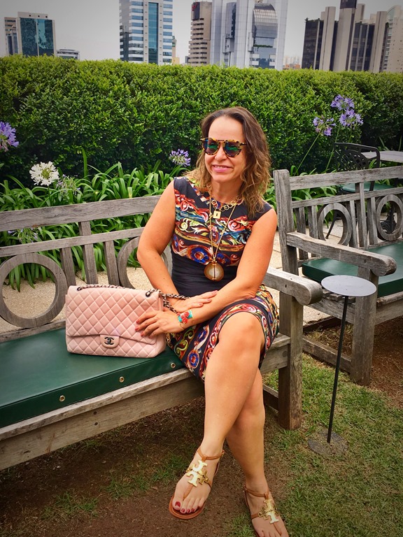 look mercadão de SP – o mesmo vestido com camisa PATACHOU – flats TORY BURCH – bag CHANEL – lenço FENDI – brinco em tanzanita e anéis JÓIAS PD –