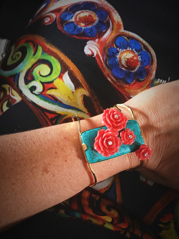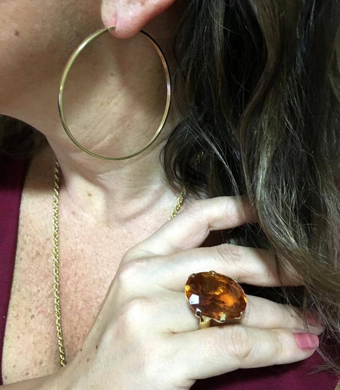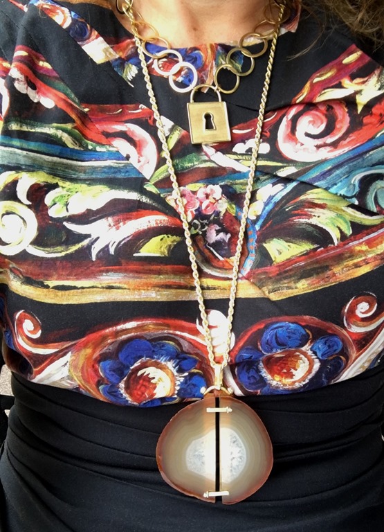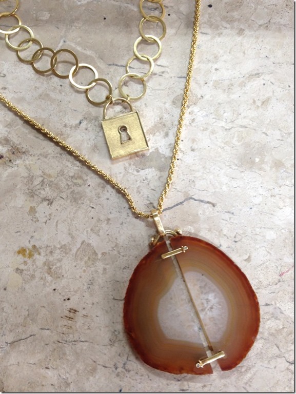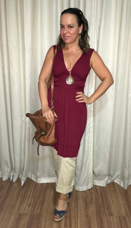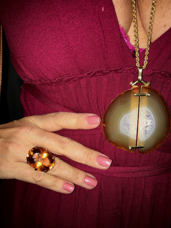 vestido CAVENDISH – calça DASLU para MARES – espadrille AREZZO – bag MULBERRY – e o mesmo colar de ágata, dessa vez com anel de citrine e argolona.