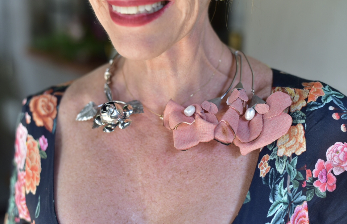 Com o propósito de manter uma coleção, eu criei um segundo colar dentro da mesma proposta anterior, usando uma rosa de antiquário.  A partir do momento em que ela virou uma joia, dei a ela um novo significado.