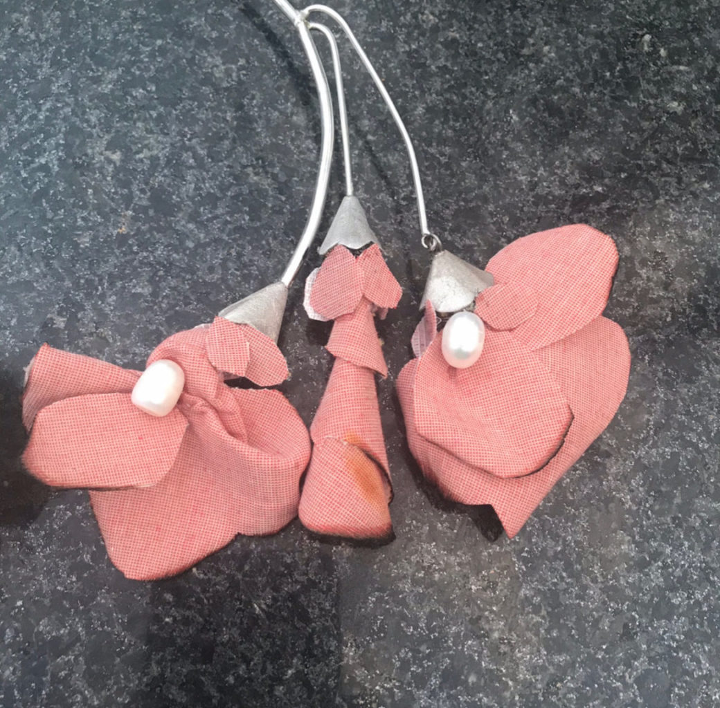 Além disso, dei o acabamento com fogo manualmente, de forma que o tecido não desfiasse e a joia mantivesse o aspecto exclusivo do feito a mão.