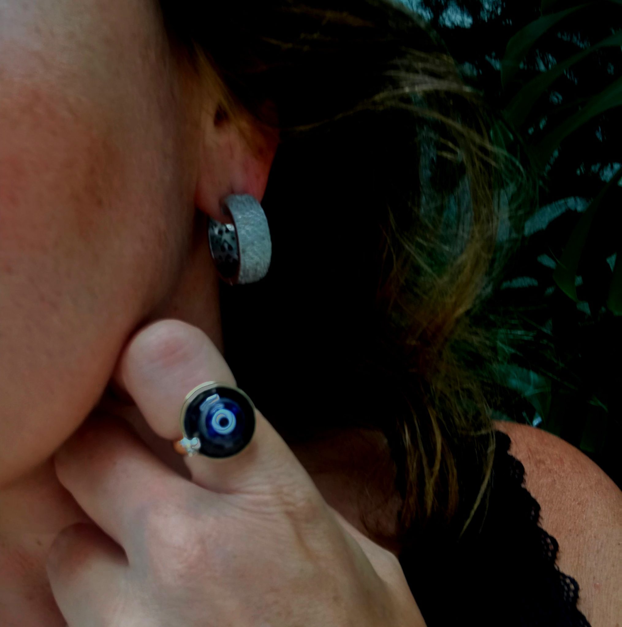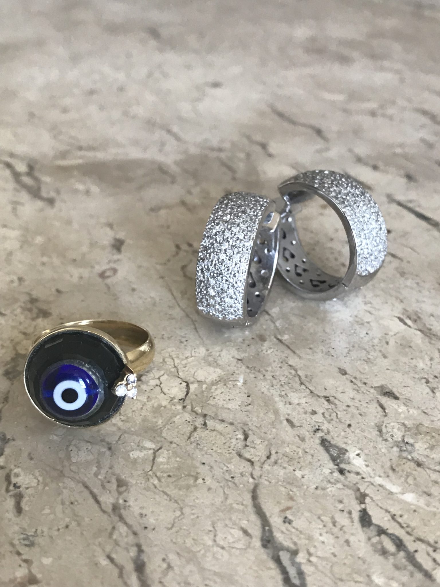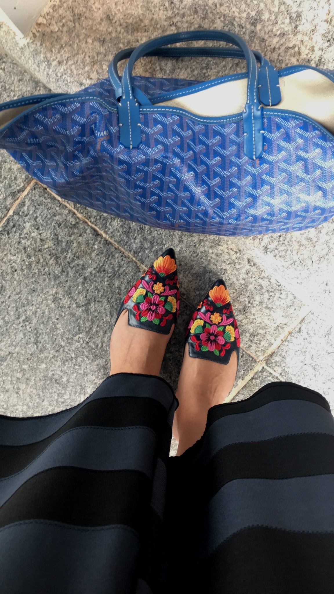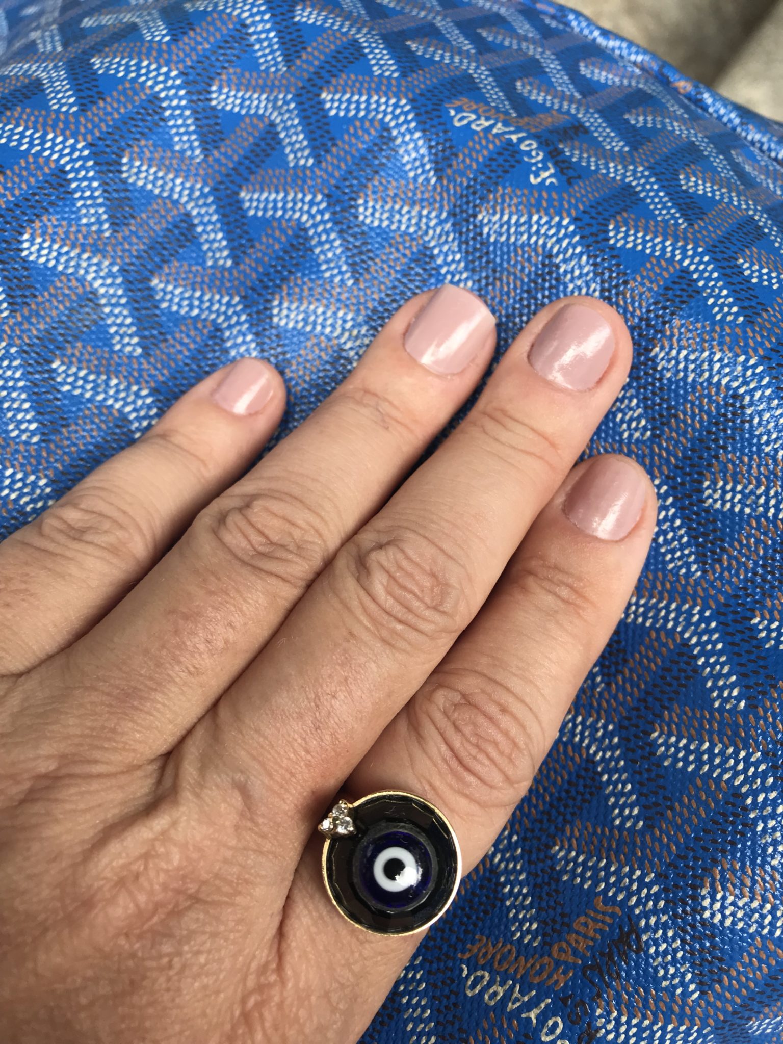 Dessa vez coloquei também um anel de olho grego JOIAS PD. Repare nos acessórios. Uma bolsa azul e mules bordadas.