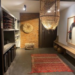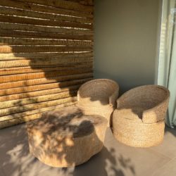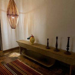 A recepção já mostra toques do decor elegante, usando pedra, tear, lustres em palha gigantes , assim como exemplares de mobiliário mineiro. Do mesmo modo, esse mesmo decor segue por toda a pousada, inclusive nos quartos.