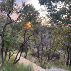 Enquanto o sol se põe, as luzes dos caminhos vão se acendendo e nos levam à noite ao restaurante.
