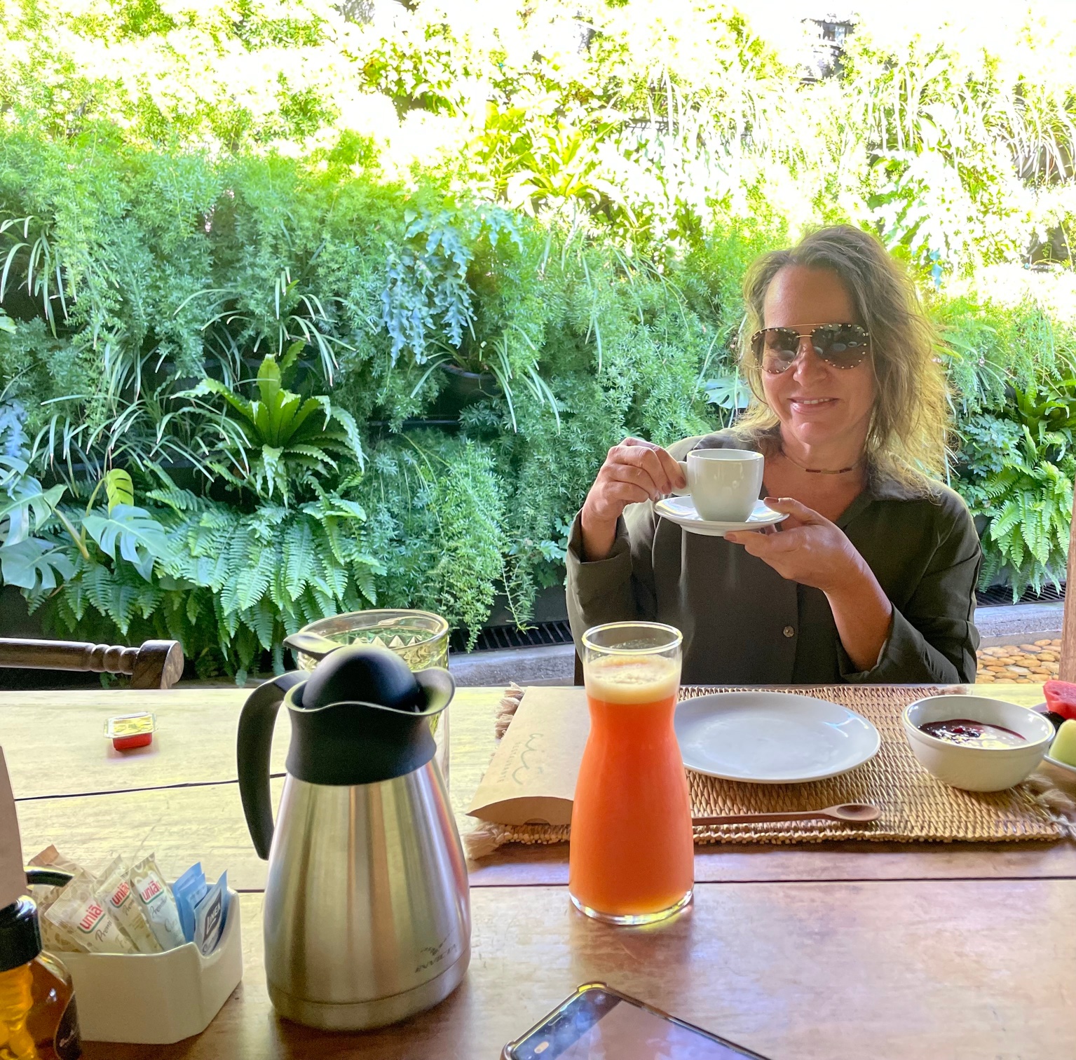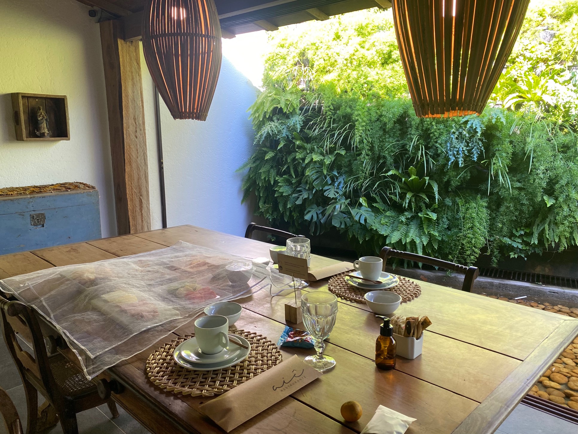 O delicioso café da manhã do hotel é servido no restaurante, de cara para uma parede verde que cai sobre um espelho d’agua com seixos rolados.