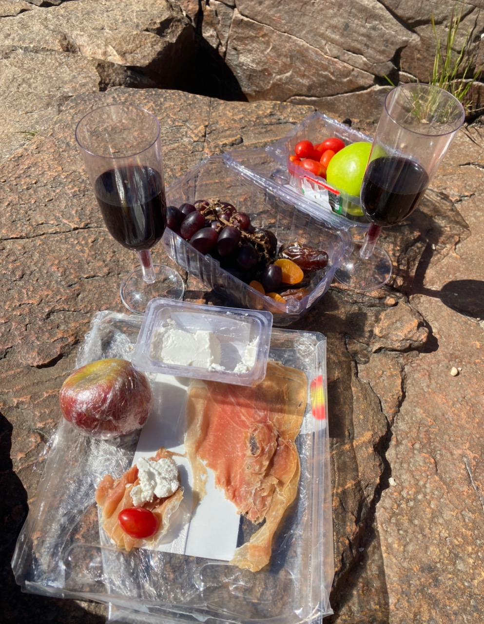 Presunto cru, queijo de cabra, tomatinhos , frutas, frutas secas, bem como água e vinho. Tudo bem frugal, assim mesmo, só para curtir o momento.