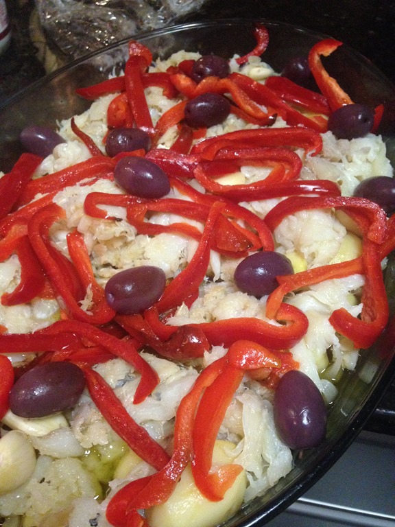 Depois da salada – como adoro servir prato único pela praticidade da coisa – esse bacalhau agrada bem e basta um arroz branco bem gostoso para acompanhar.