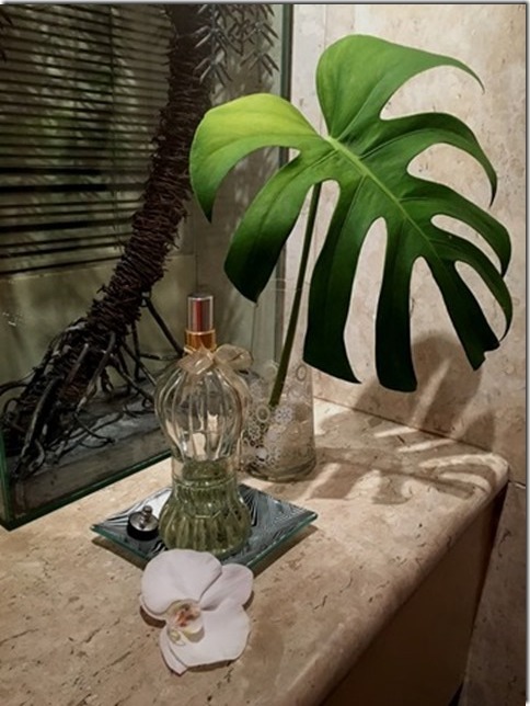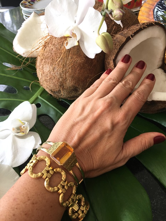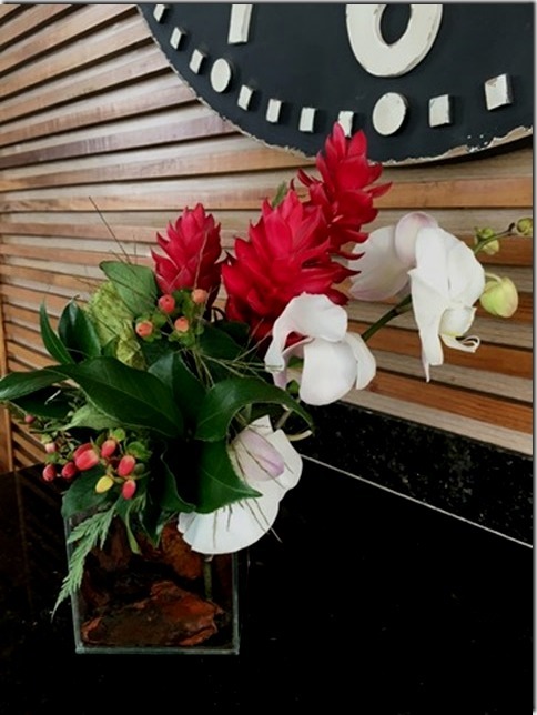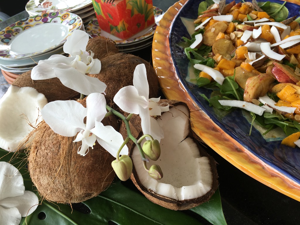 Assim fiz o meu arranjo: com imbé e orquídea de casa mesmo e os cocos que eu já havia comprado para fazer a salada. Uma coisa bem tropical !