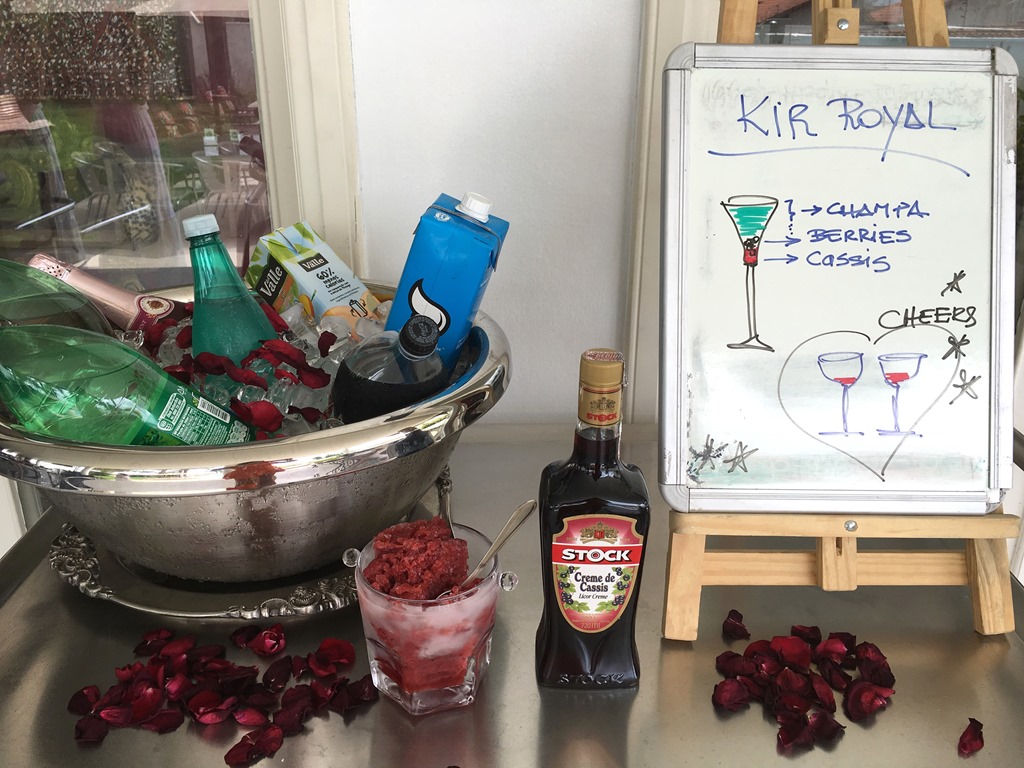 Montei um carrinho-bar sugerindo que cada um preparasse seu próprio KIR ROYAL.