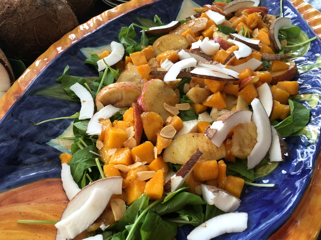 Ingredientes: 2 maços de rúcula baby – 1 manga ( mais firme ) em cubos – 1 coco seco em cubos ou lascas – 2 maçãs vermelhas com casca em fatias