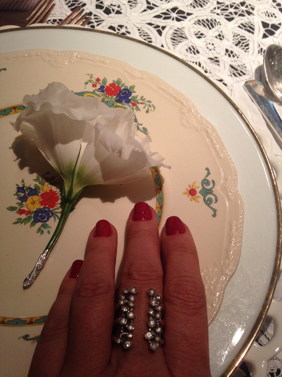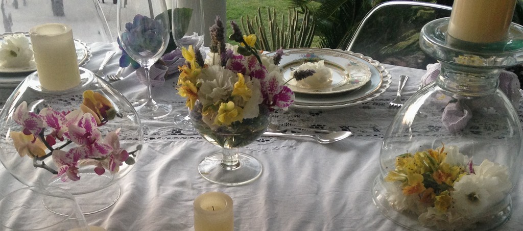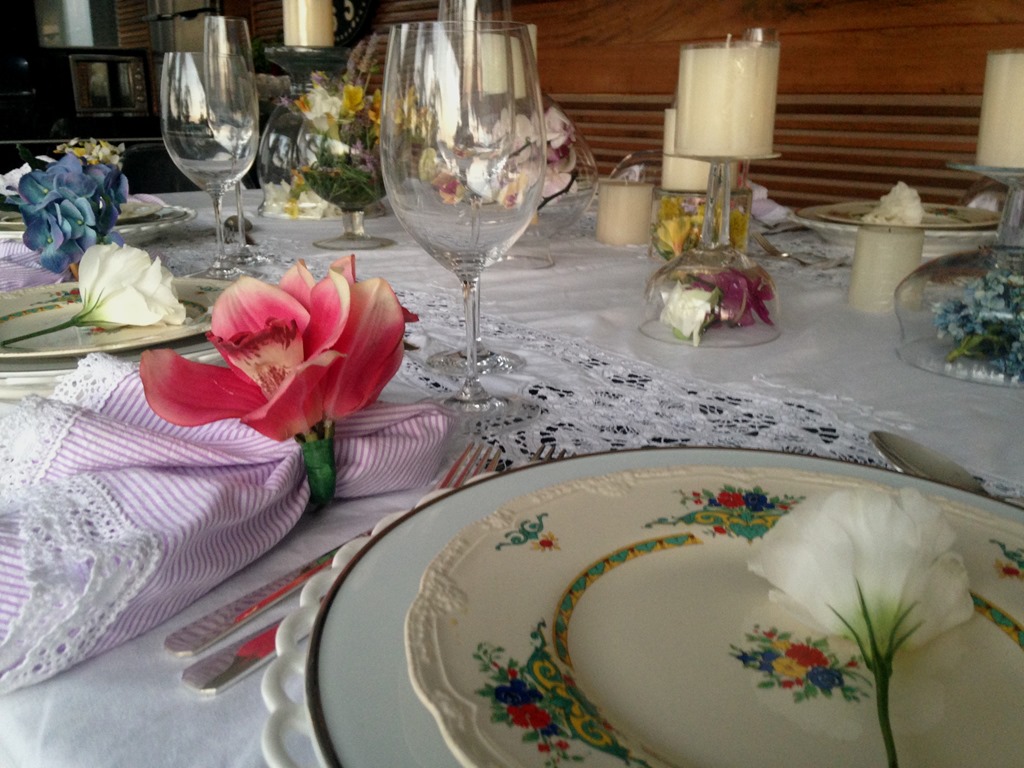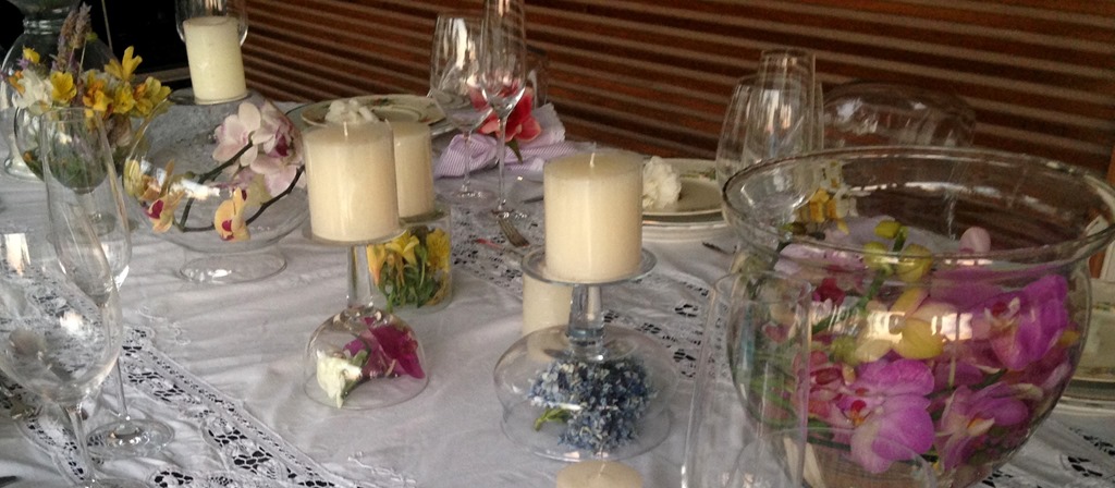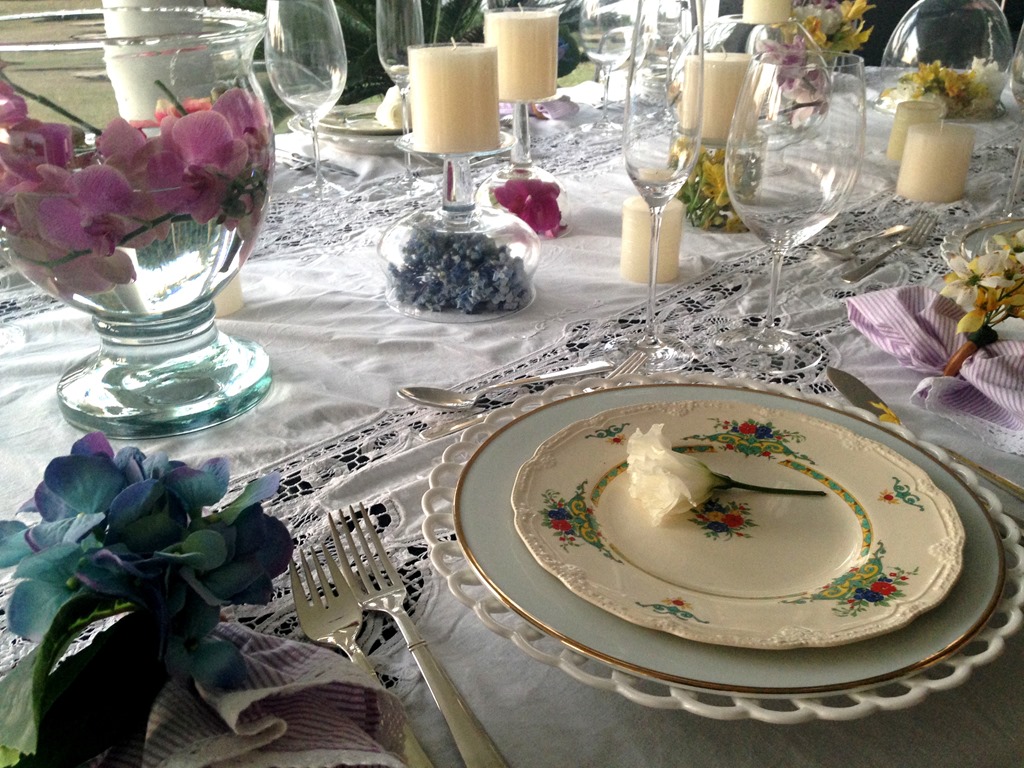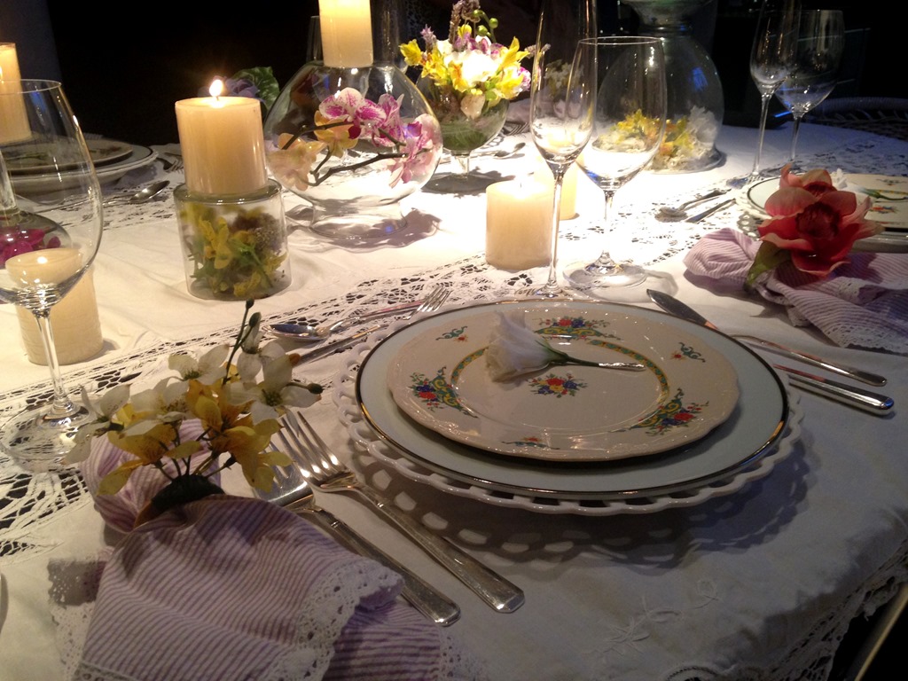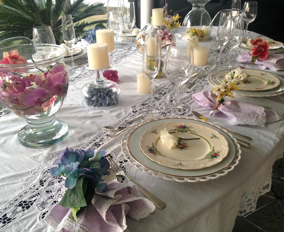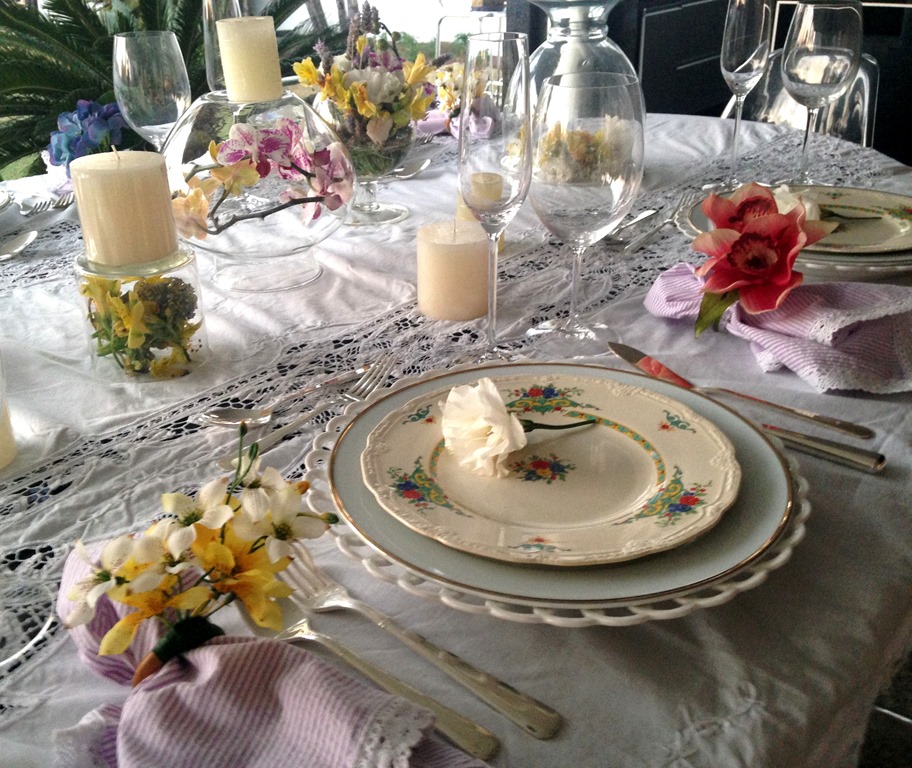 Gostei da toalha branca com louça branca , da florzinha displicente em cima do prato, das velas soltas pela mesa , do prato floral e das flores dentro dos vidros. E fiz a minha!