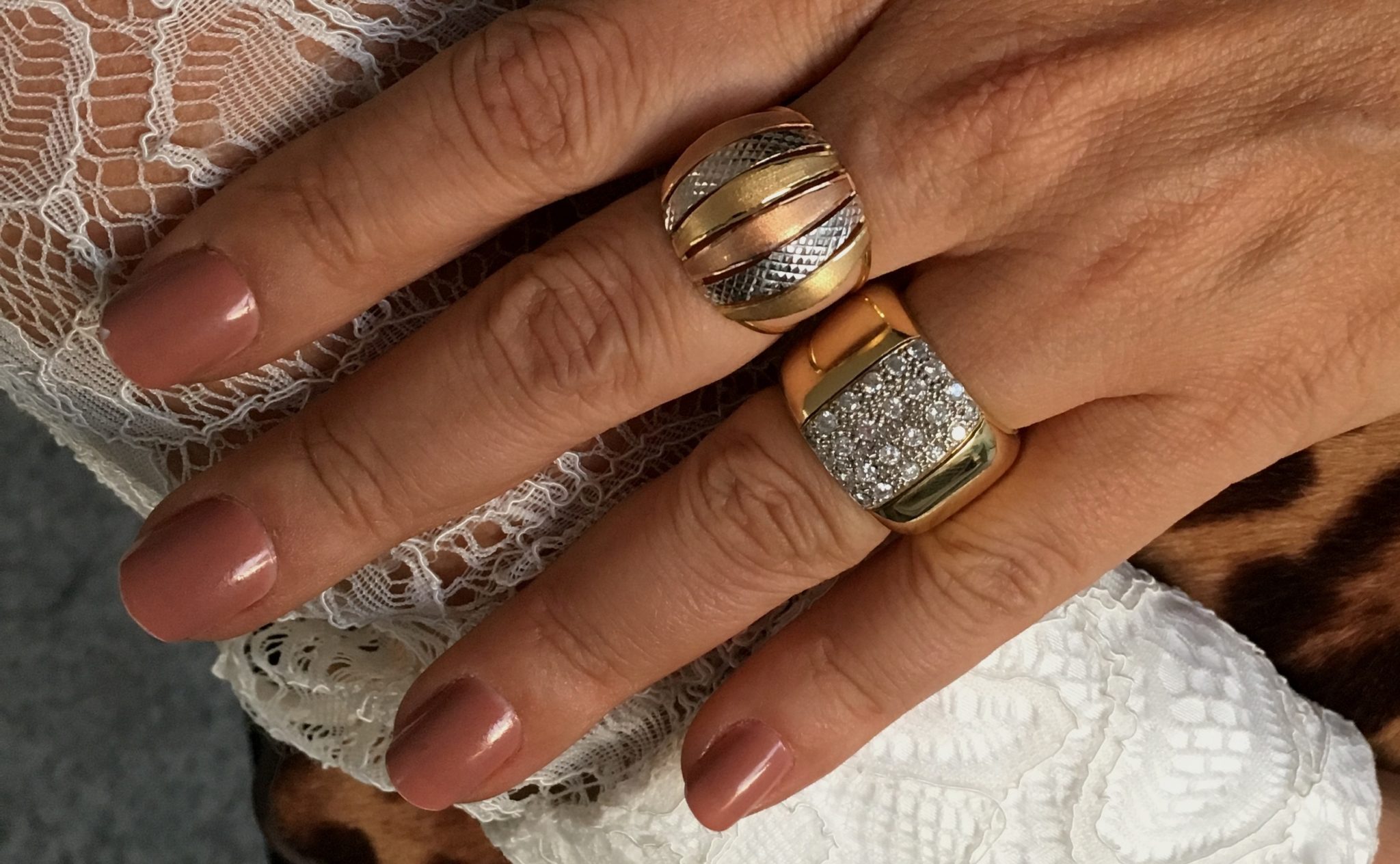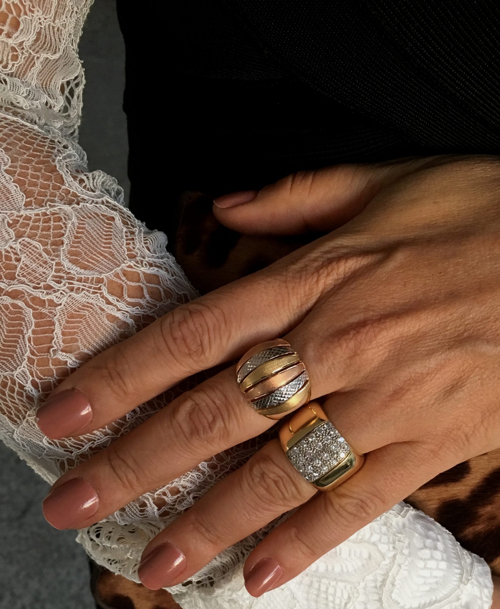 Assim, escolhi usar argola em ouro amarelo e pérolas , como também o mix de 2 anéis em ouro amarelo e brilhantes