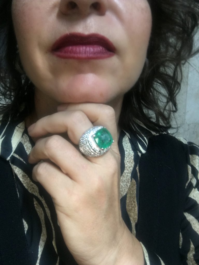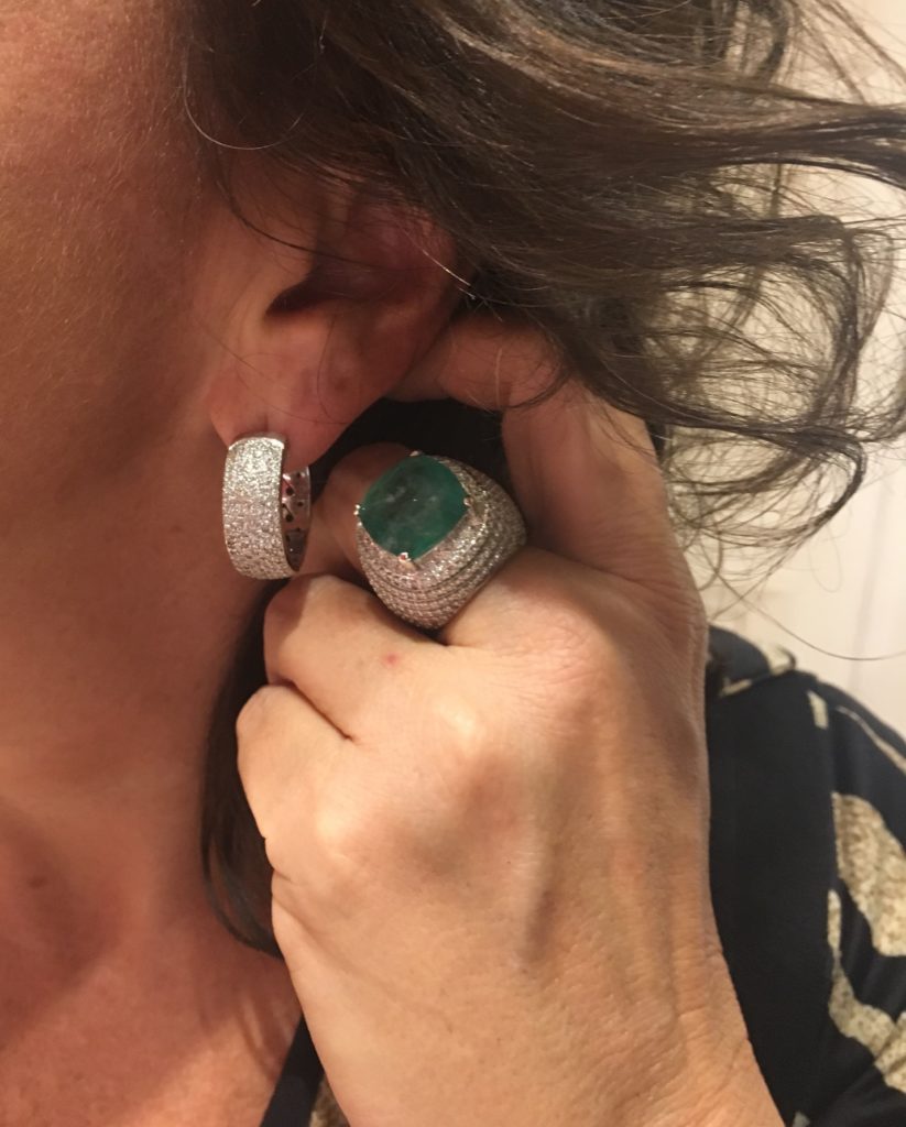 Além da argola de brilhantes, escolhi usar um super anel em esmeraldas.