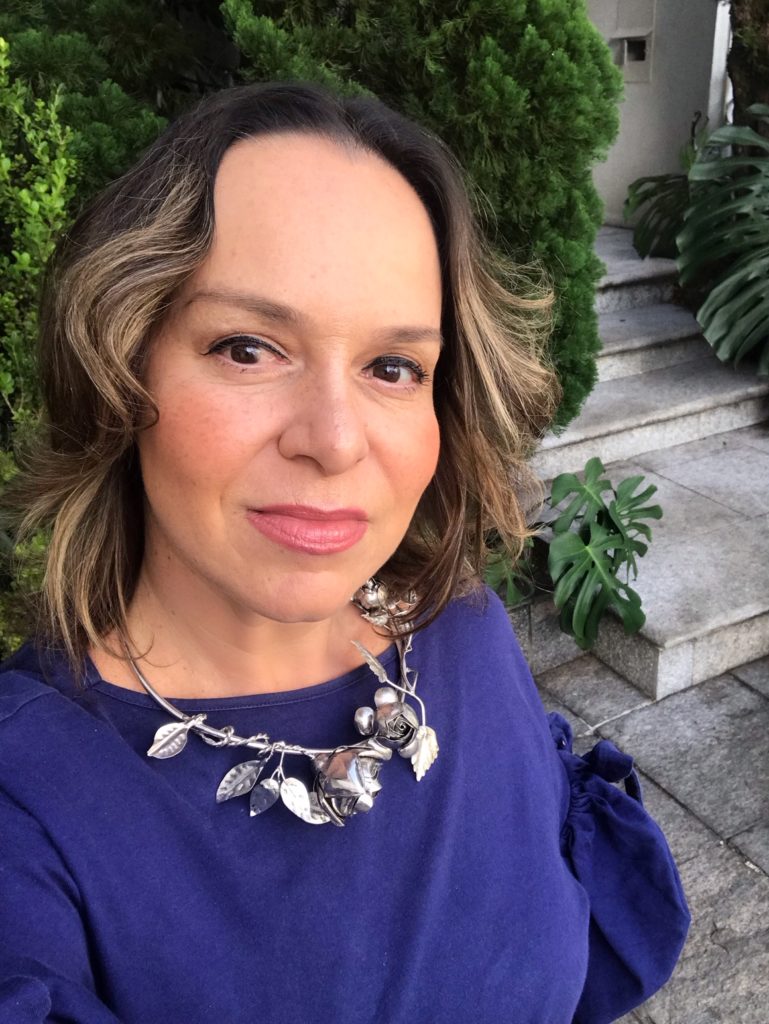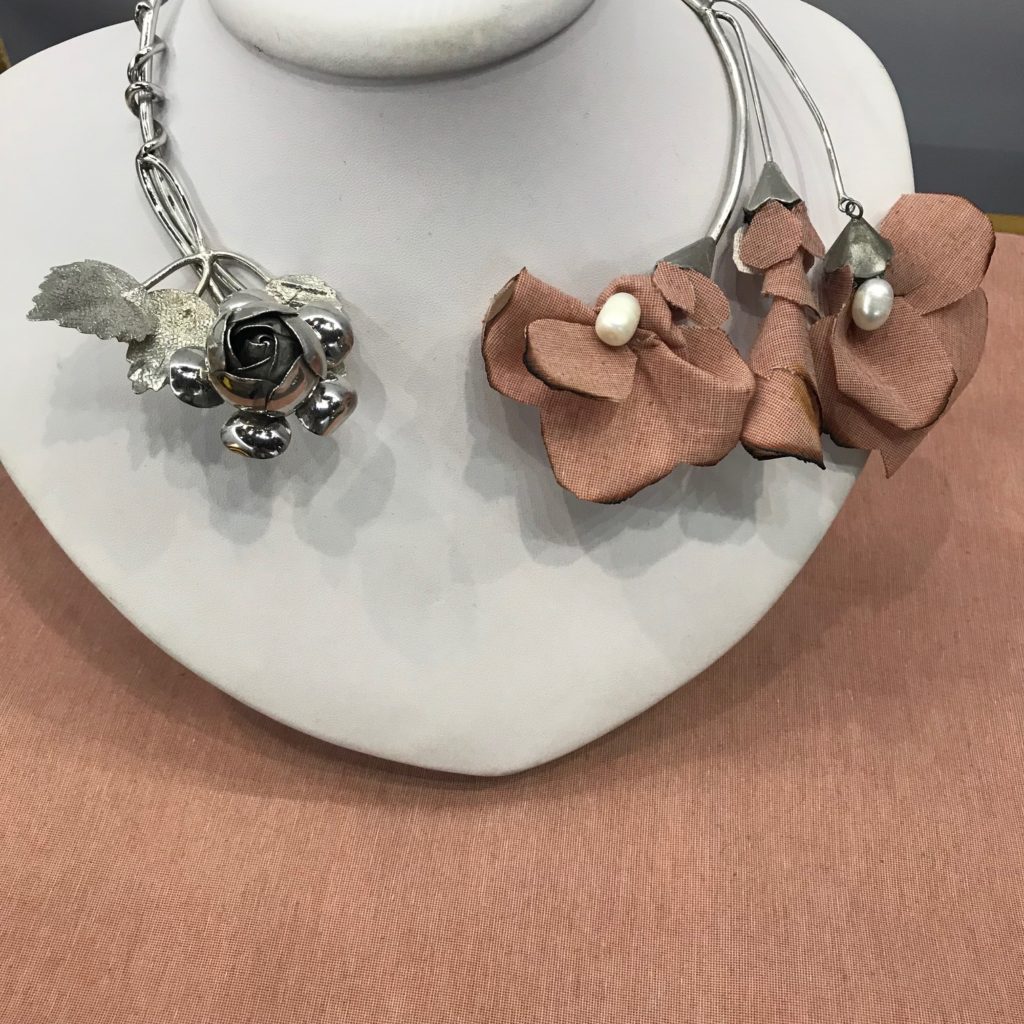 Desenvolvi então esse colar com as orquídeas feitas à mão com tecido sustentável e miolo de pérolas. As flores foram montadas em suporte de prata com rosas que busquei em antiquário. Com isso, o conceito da ECONOMIA CIRCULAR torna-se ainda mais abrangente, pois além do tecido “politicamente correto”, ainda há uma re-utilização de uma peça que já existia. Se você clicar AQUI, vai acompanhar o processo criativo desde a procura das rosas, pontapé inicial desse projeto.
