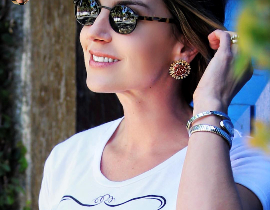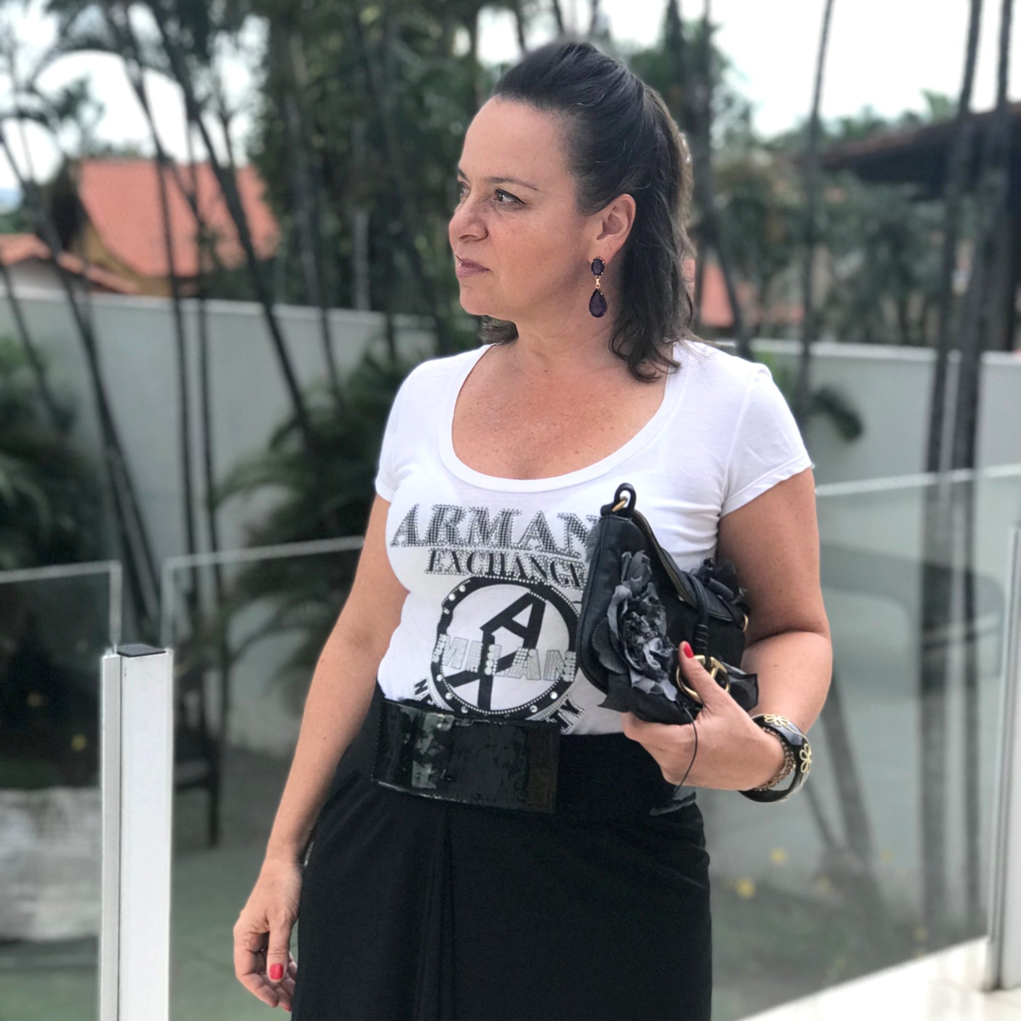 A idéia é a mesma: camiseta PB, saia preta, acessórios femininos e um toque de cor. Cris escolheu usar seu conjunto em coral JOIAS PD. São mini-miçangas encrustadas uma a uma manualmente na estrutura de ouro.
