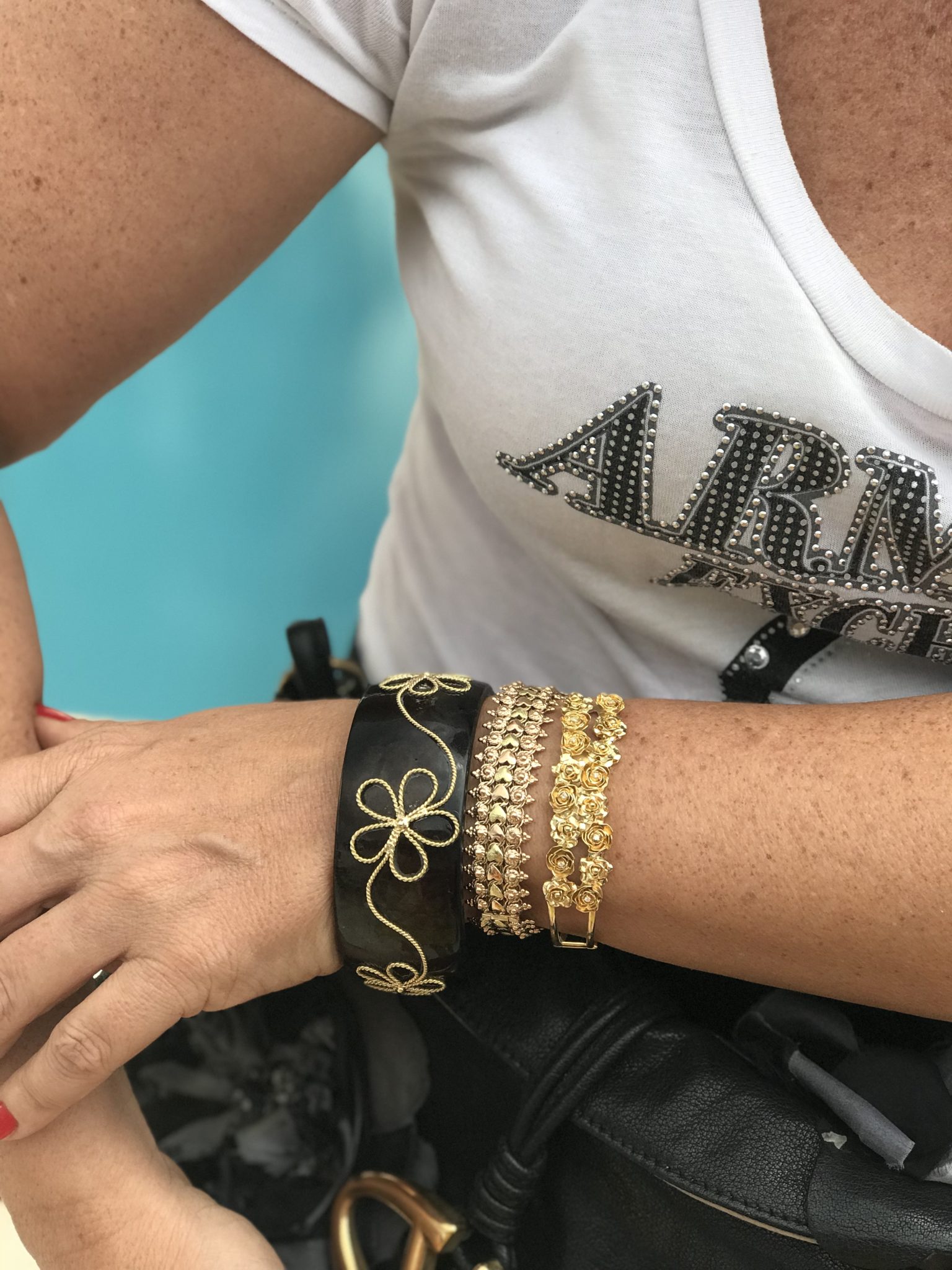 O mix de pulseiras de flores bem romântico conversa com a bolsa VALENTINO. Completei o look PB com um toque de cor: azul na sandália e roxo nas pedras.