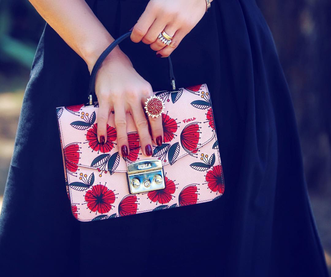 Cintura marcada, bolsa de flores, sandália de laços. A estética é bem feminina, quebrada apenas pela camiseta que dá essa cara “rock´n roll “.