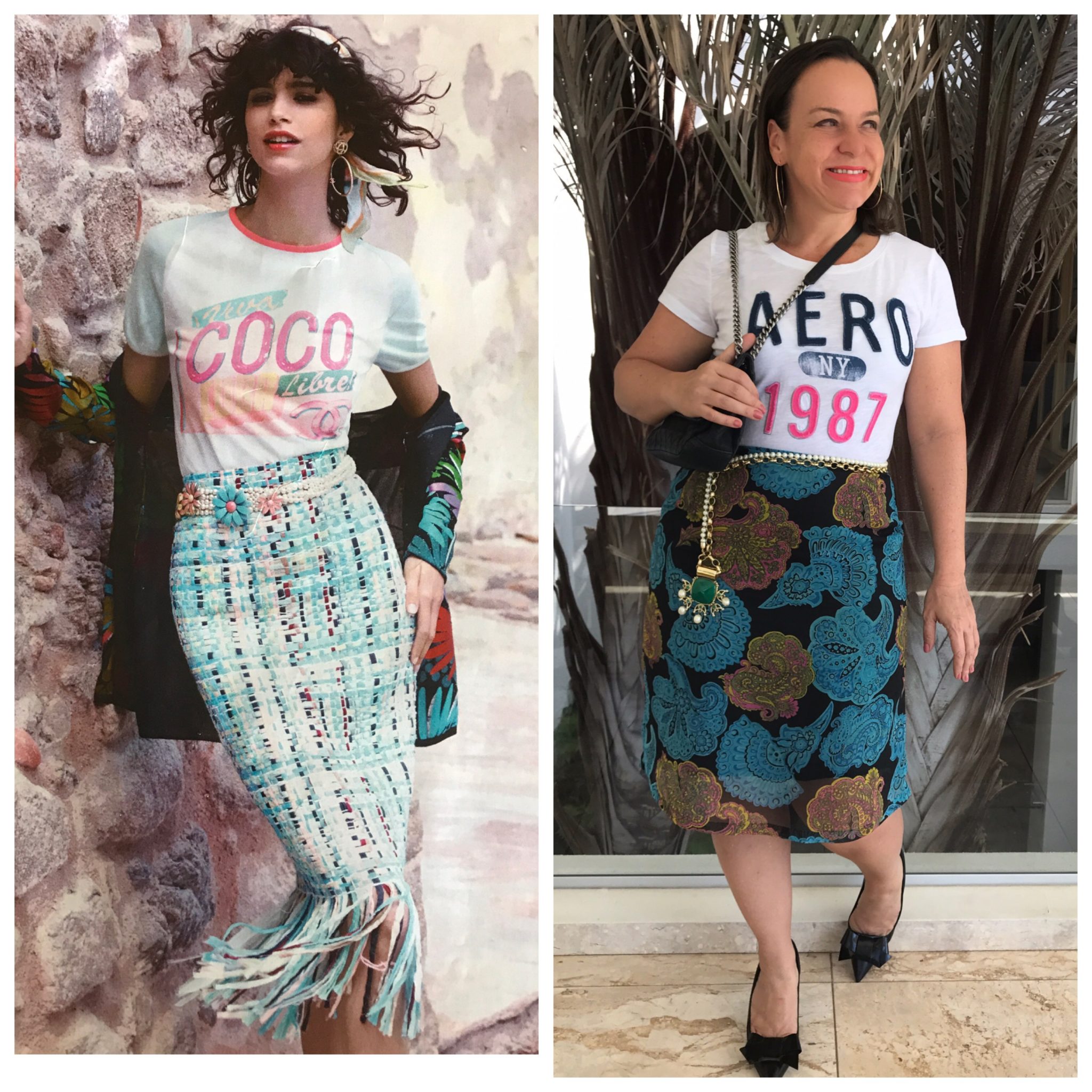 E você, curte sair de camiseta? Acho uma estética linda para o verão na cidade. É só escolher a sua – nada de t-shirt lisa, viu? – colocar uma saia feminina e sair por aí. Vale ser midi, de babados, longa, etc.. A idéia é ser feminina e transgressora ao mesmo tempo.