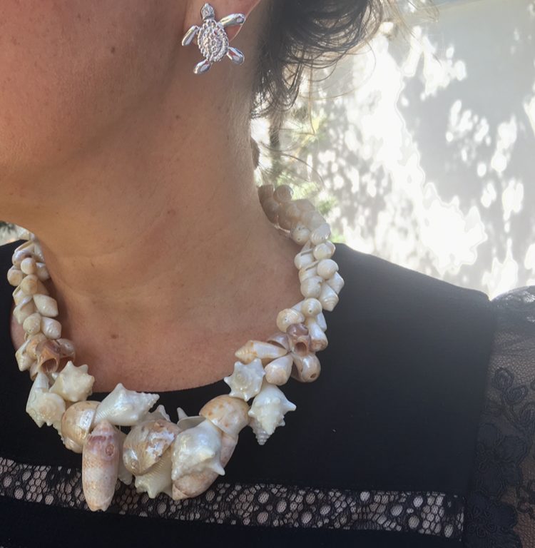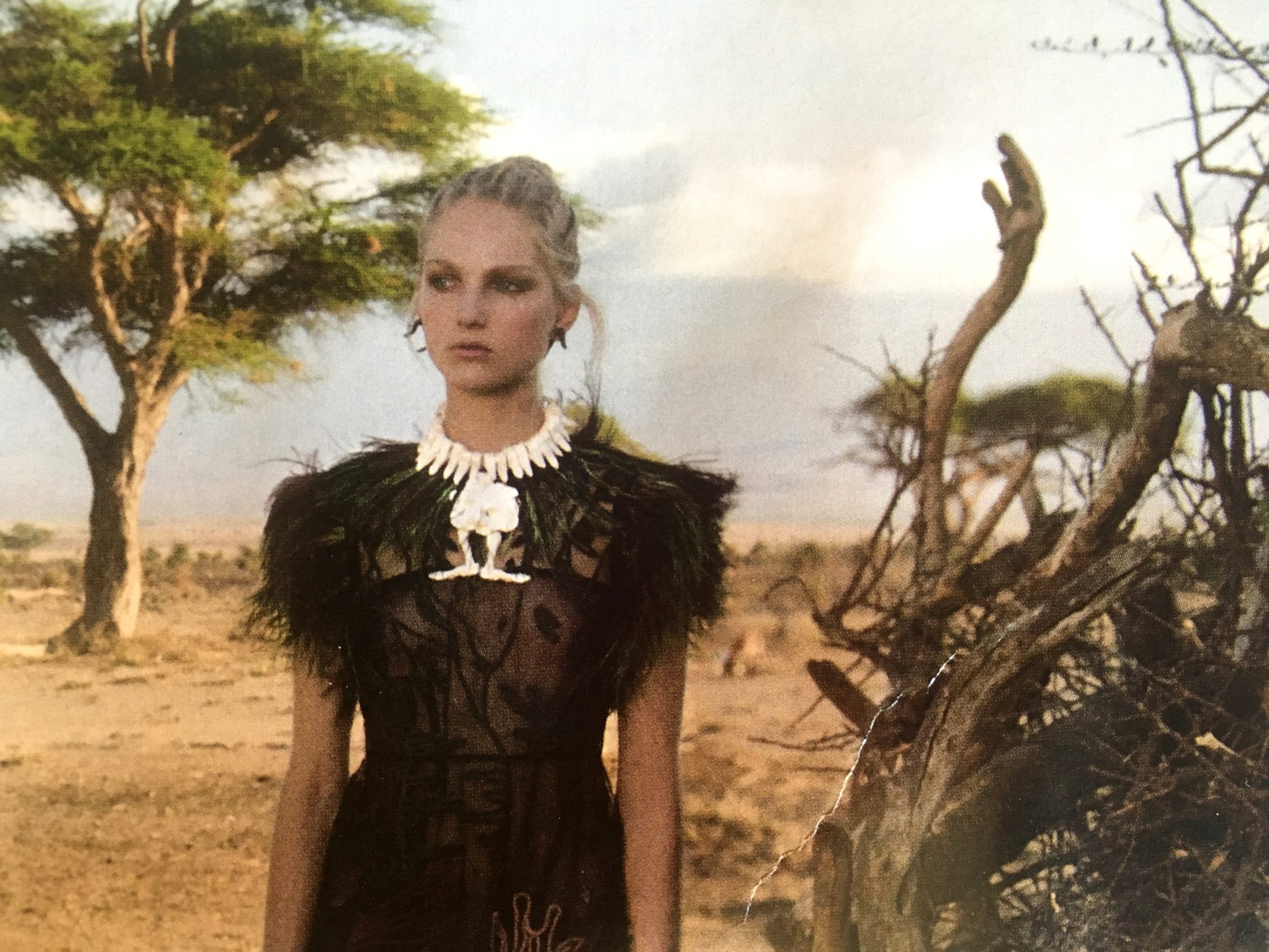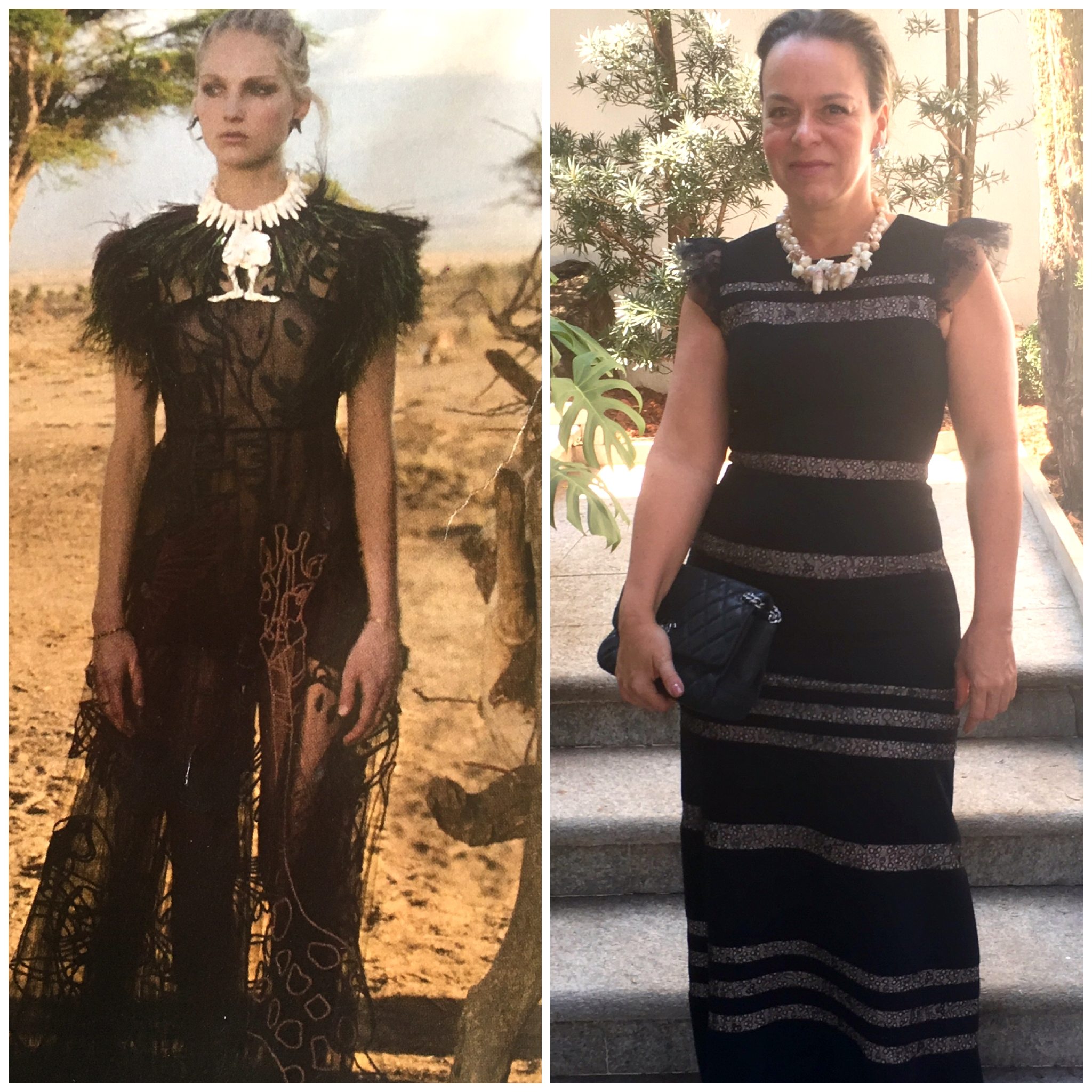 Na campanha da VALENTINO, foi feito um contraste da leveza do tule negro com a rusticidade e a força dos complementos africanos em osso branco. Quis manter esse contraste – achei moderno isso! – e misturei um colar de conchas, madrepérolas e corda com uma tartaruga em ouro branco JÓIAS PD. Tudo do mar! Uma ousadia , but …