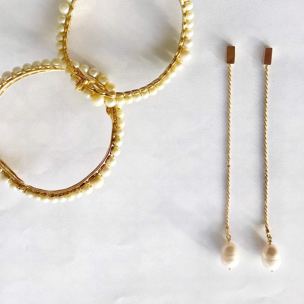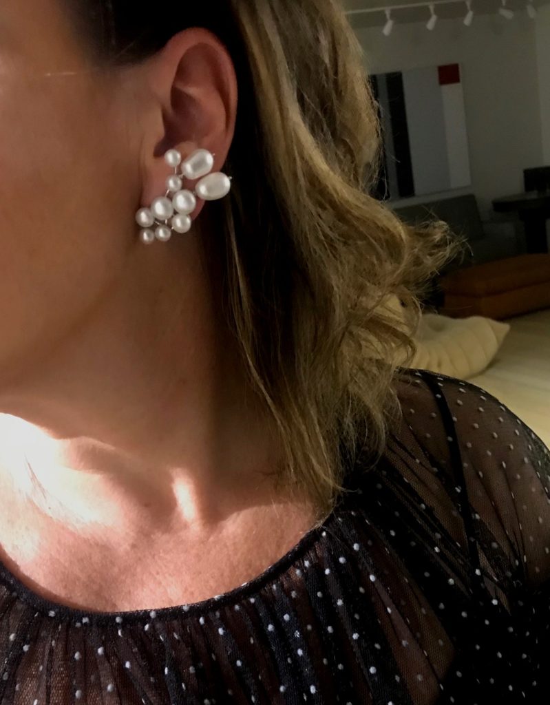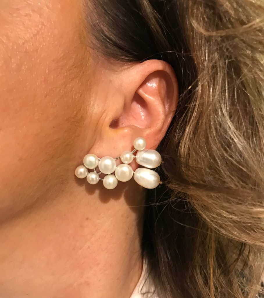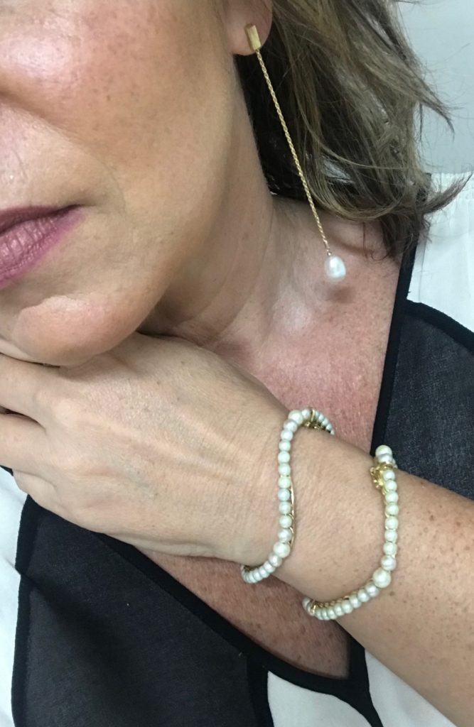 Escolhi usar joias em pérolas, mas não aquelas de antigamente com cara de vovó. O desenho anatômico da PULSEIRA ONDA faz contraponto com a elegância simples do brinco TRILHA | 10 X R$160,00 = R$1600,00