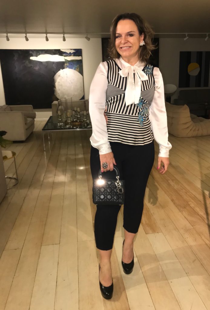 Esse era um top simples de tricô listrado, mas ano passado eu mandei aplicar florões de renda colorida e já usei outras vezes, como você pode ver AQUI .