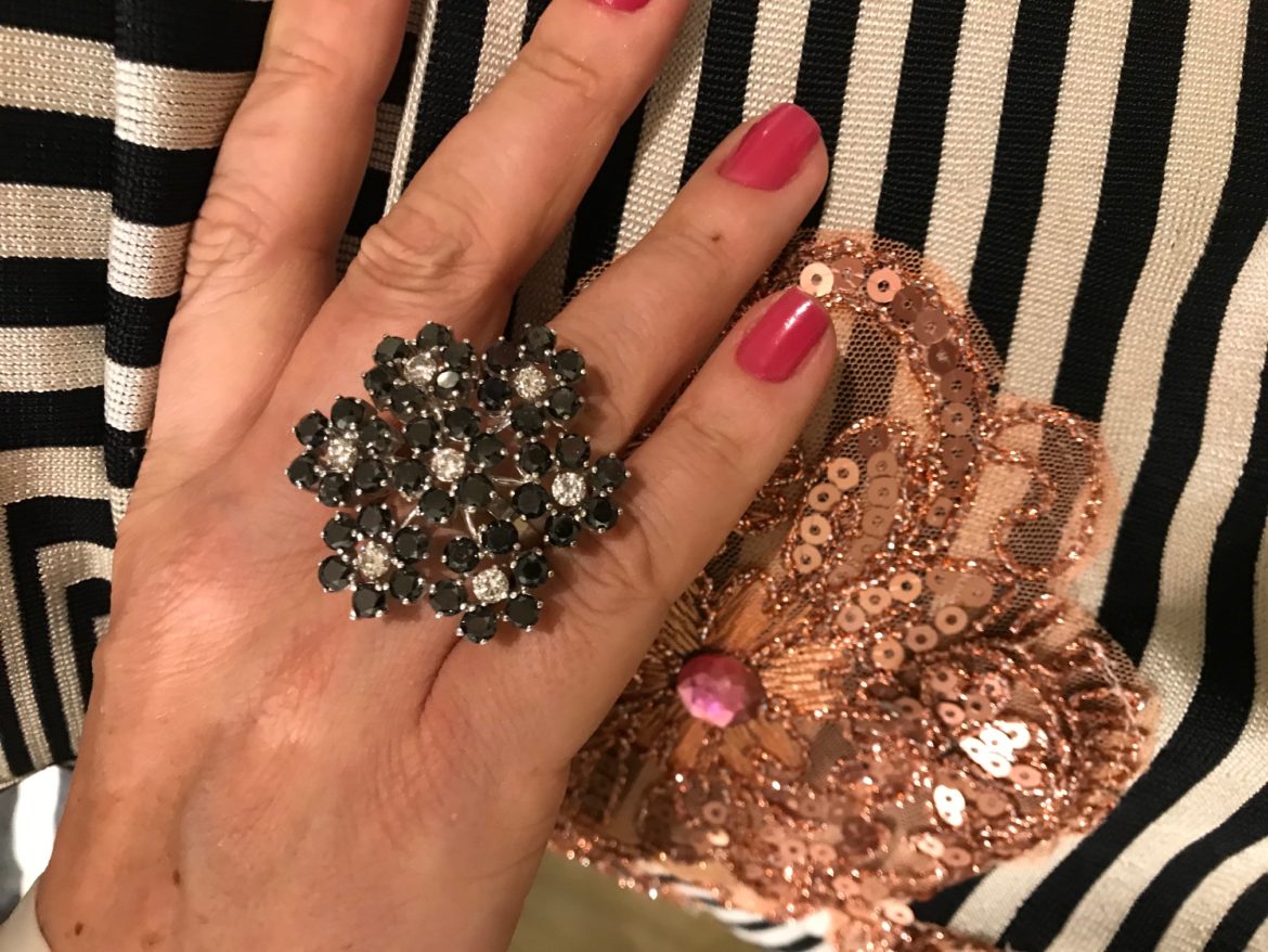 Como sempre digo, adoro combinar joias ou pela cor, ou pela forma ou pelo tema. Dessa vez, uma flor de brilhantes conversando com a flor da renda, similarmente ricas e poderosas.