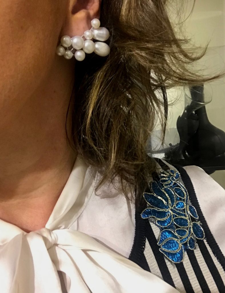 Camisa de laço ( a propósito, acho chiquérrimo! ) combina com pérolas, concorda? Mais uma vez uma peça sem cara de vovozinha. O design do earcuff não só é arrojado por ele mesmo, como também tem um movimento extra por ter tamanhos diversos de pérolas. | EARCUFF : 10 X R$ 330,00 = R$ 3300,00 |