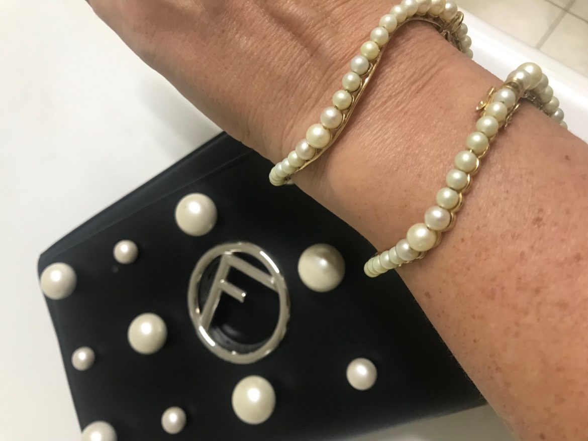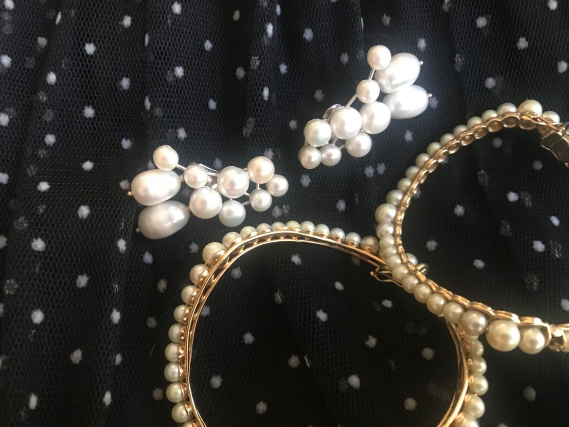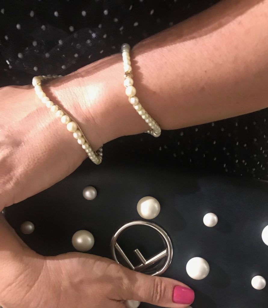 Não só a bolsa repetiu as bolinhas, como também as joias. Pérolas funcionam como poás, você sabia?