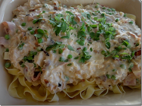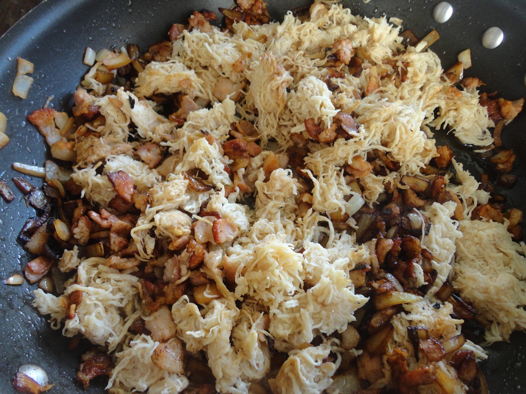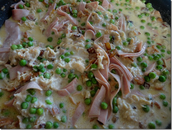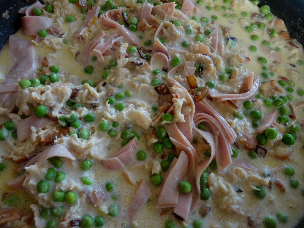 Adicione leite com um pouco de maisena dissolvida, gorgonzola , parmesão ralado, formando um molho branco espesso. Adicione ervilhas congeladas, tiras de presunto e deixe ferver um pouco ,até tudo ficar bem misturado. Se for necessário, acrescente mais leite. Se gostar , adicione creme de leite. Eu prefiro sem.