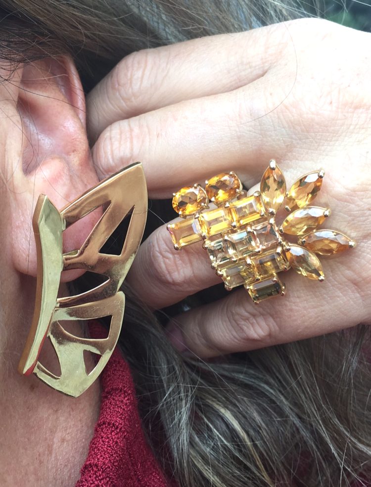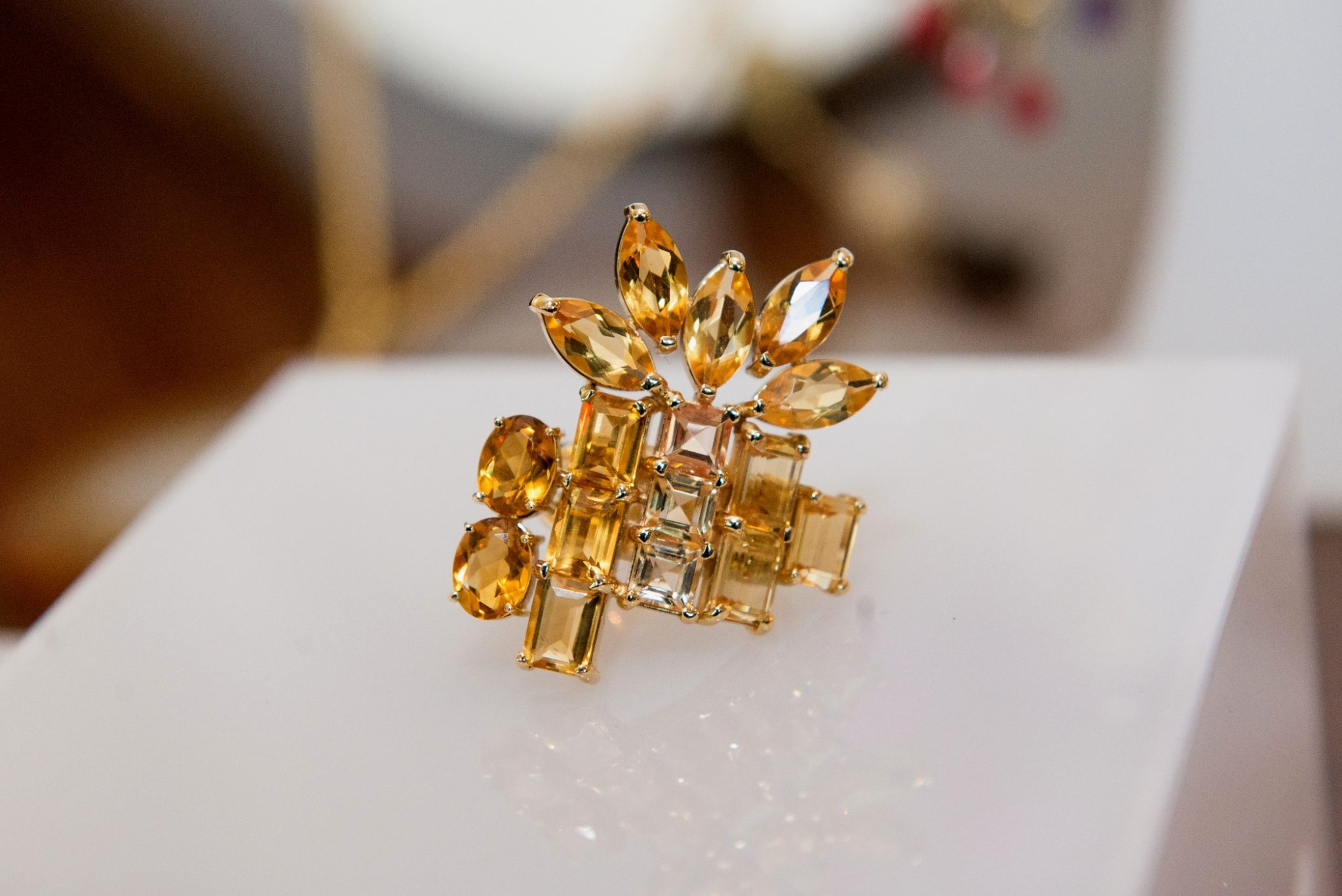 anel pirãmide em ouro amarelo, citrine e topázio imperial