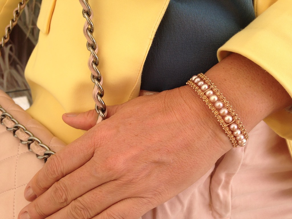 brinco em turmalina rsa e brilhantes e pulseira em ouro rosa e pérolas rosa.