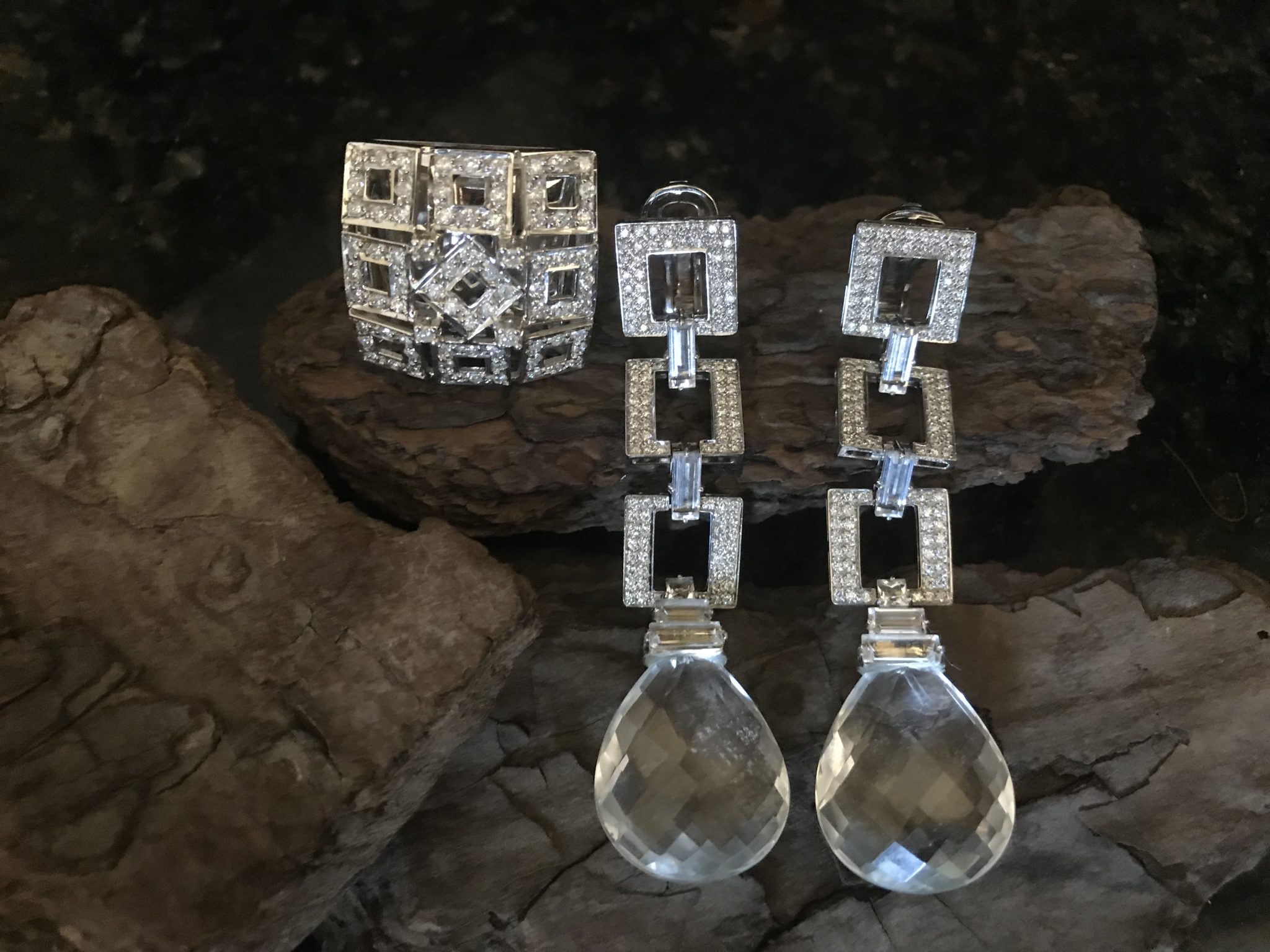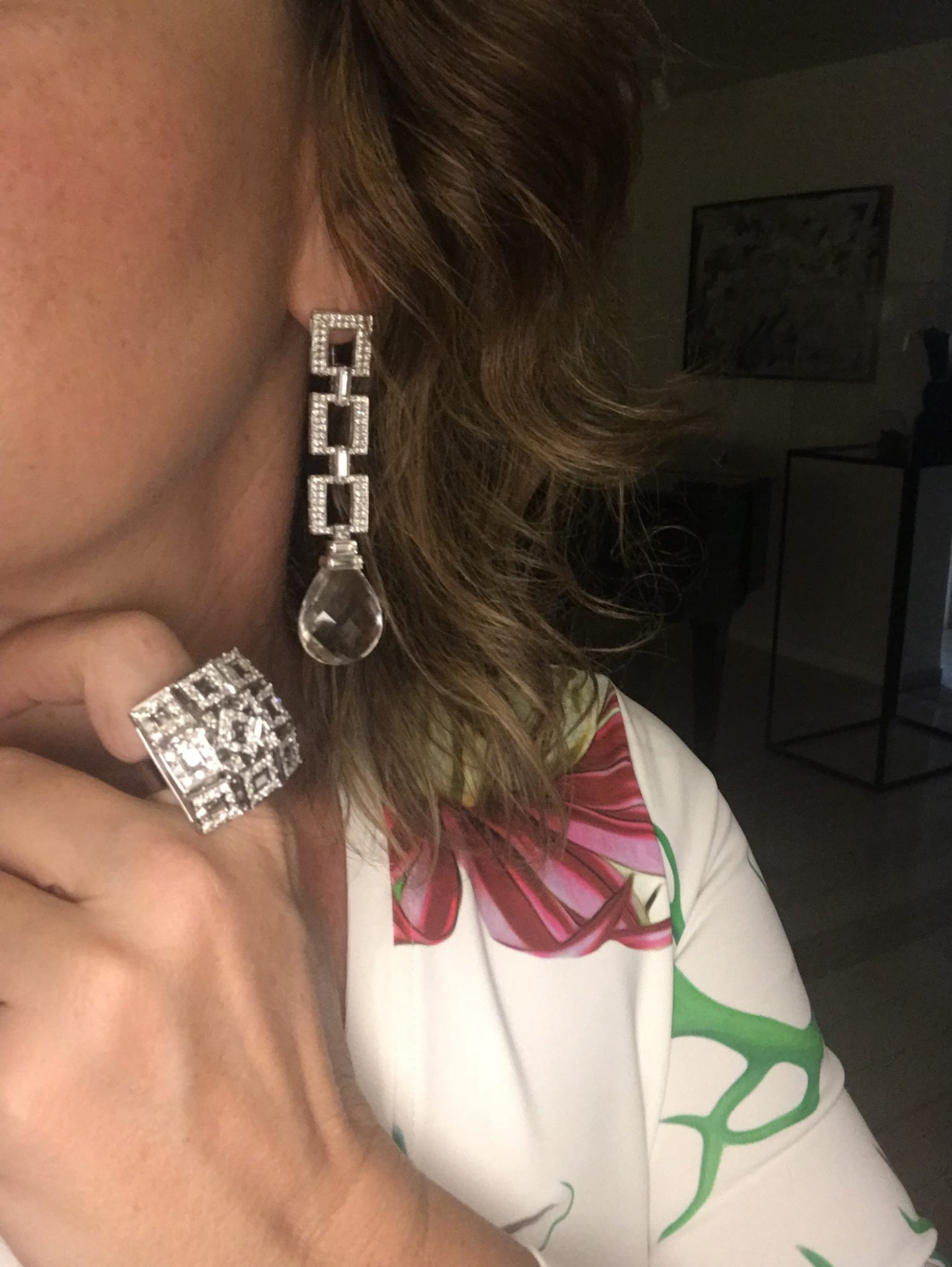 Repare que os quadrados de brilhantes se repetem nos brincos.