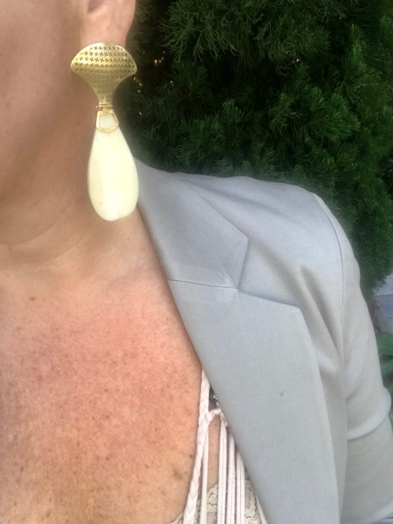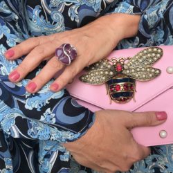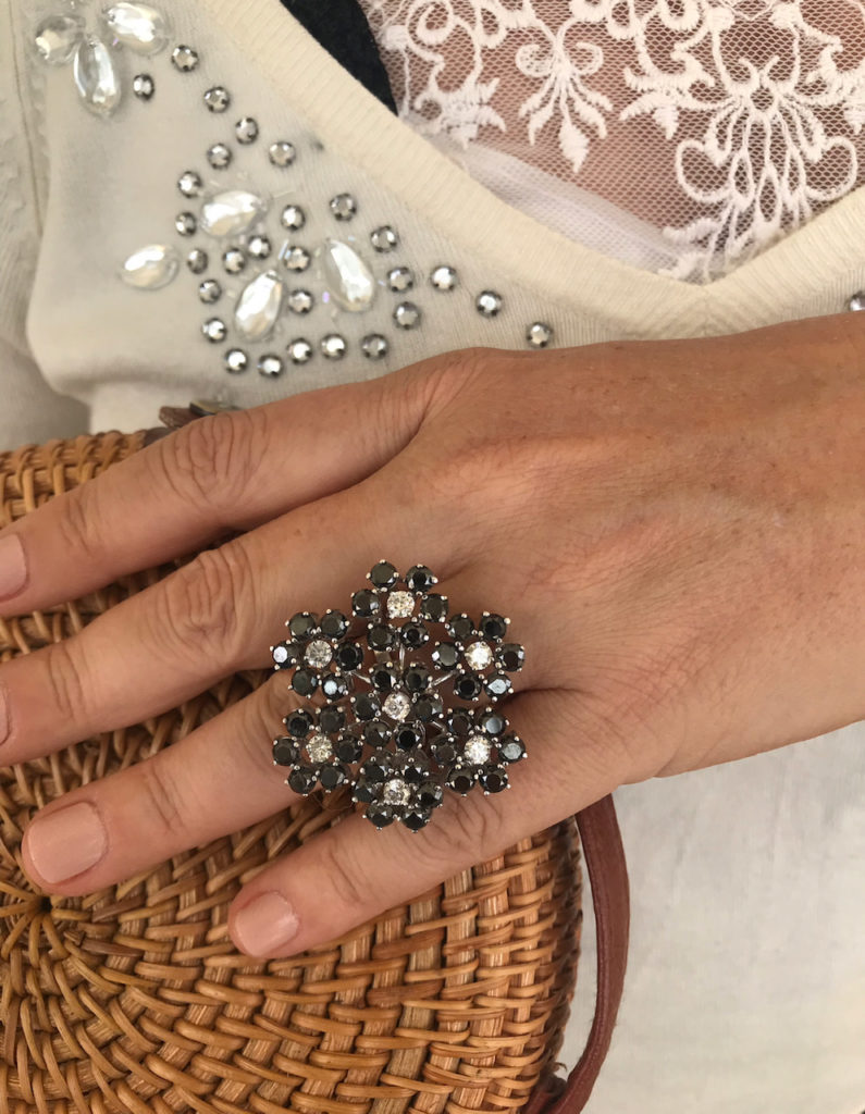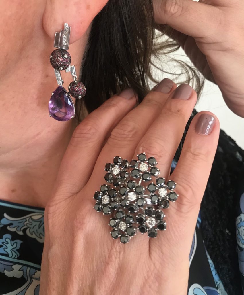 Escolhi usar um brinco em ametista fazendo um contraste de cor e anel todo em brilhantes.