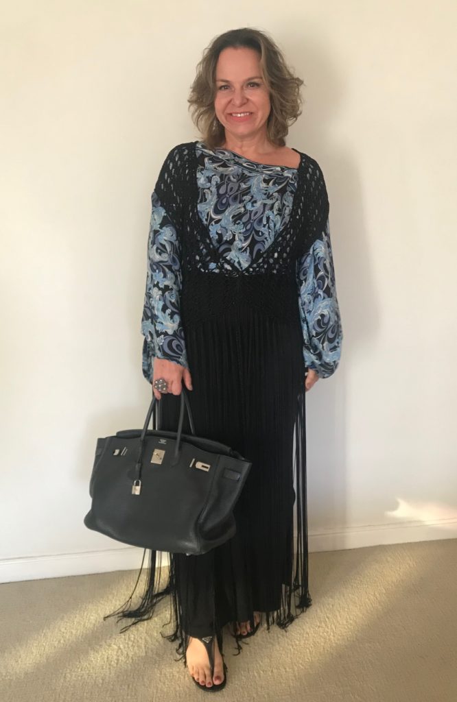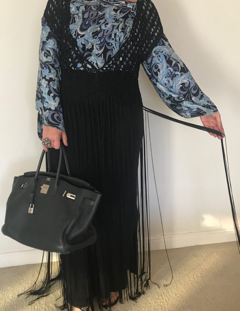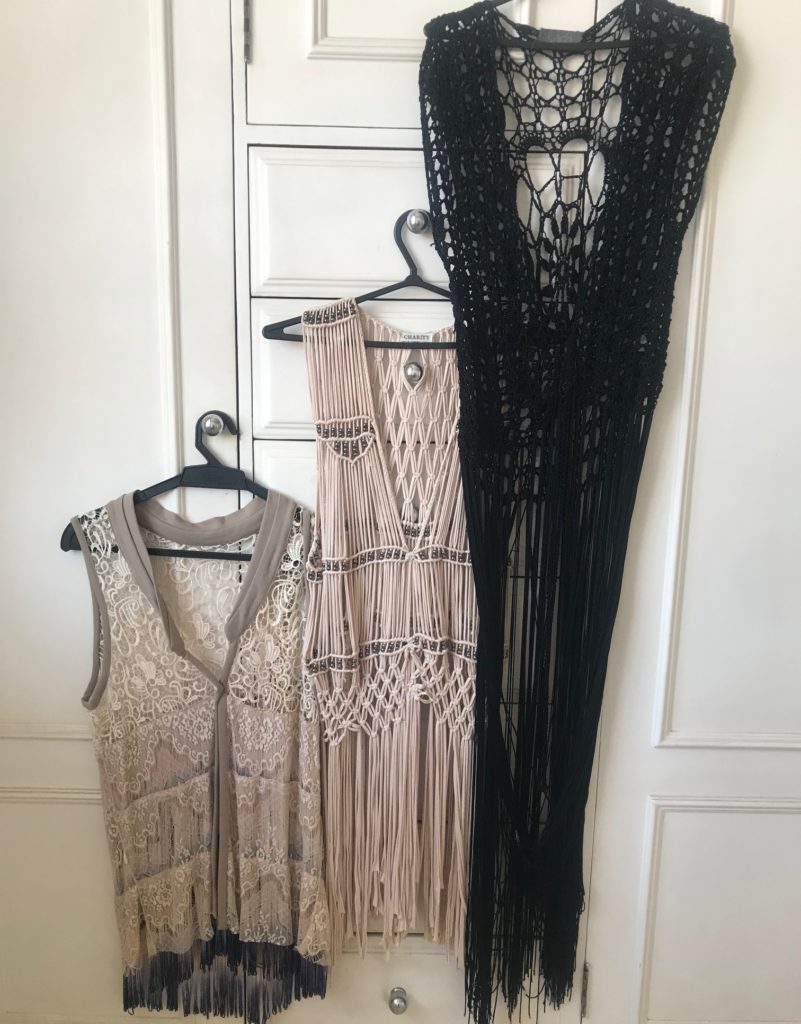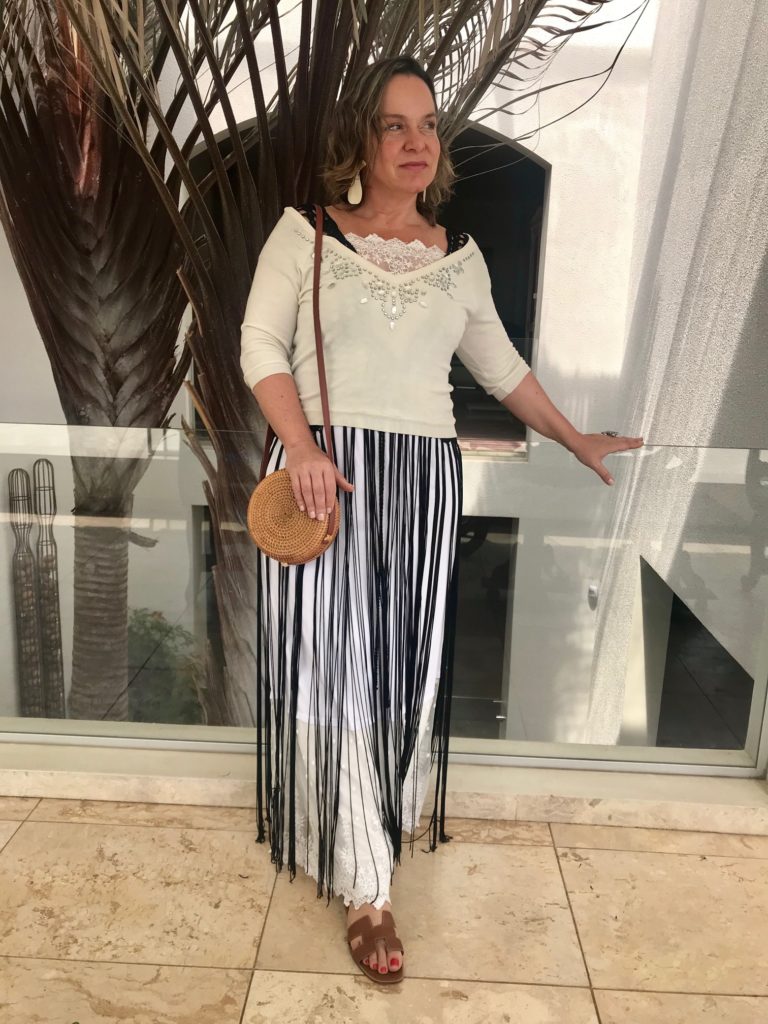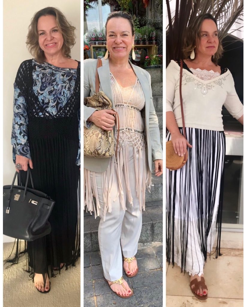 Fui olhar no meu closet, e vi que tinha não apenas um, mas sim 3 coletões de franjas. O preto da foto eu trouxe de Mykonos , o bege é da TAHARI e eu ainda tenho mais um da MARES .