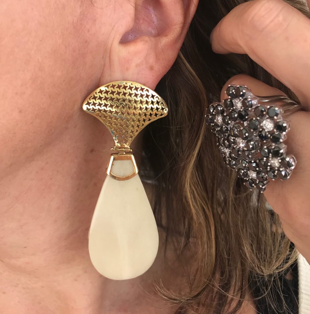 Dessa vez, além da trama do colete, usei ainda uma trama a mais: a bolsa de palha. Entretanto, misturei ainda um brinco com osso e ouro e o anel todo em brilhantes.