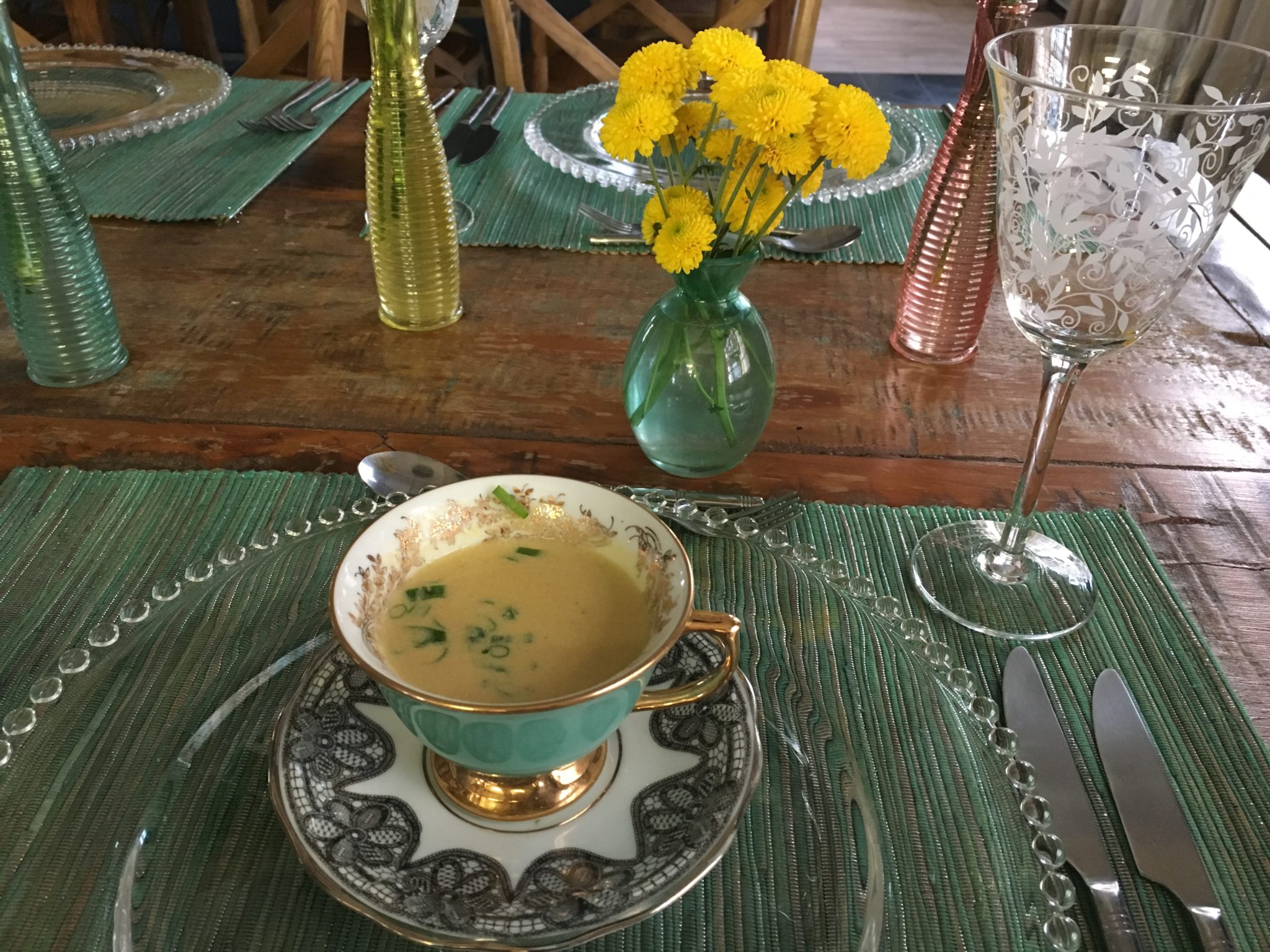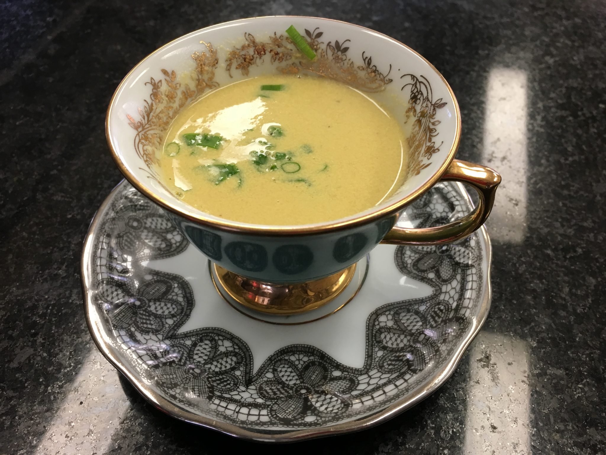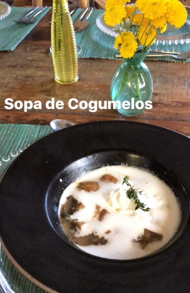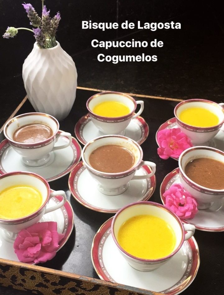 A entrada foi uma SOPA DE COGUMELOS, uma variação do CAPUCCINO DE COGUMELOS, porém com pedaços maiores. Depois ela serviu uma BISQUE DE LAGOSTA. Bisque é uma sopa típica da culinária francesa que consiste em um caldo de carne ou de crustáceos engrossado com crème fraiche ou outros ingredientes.