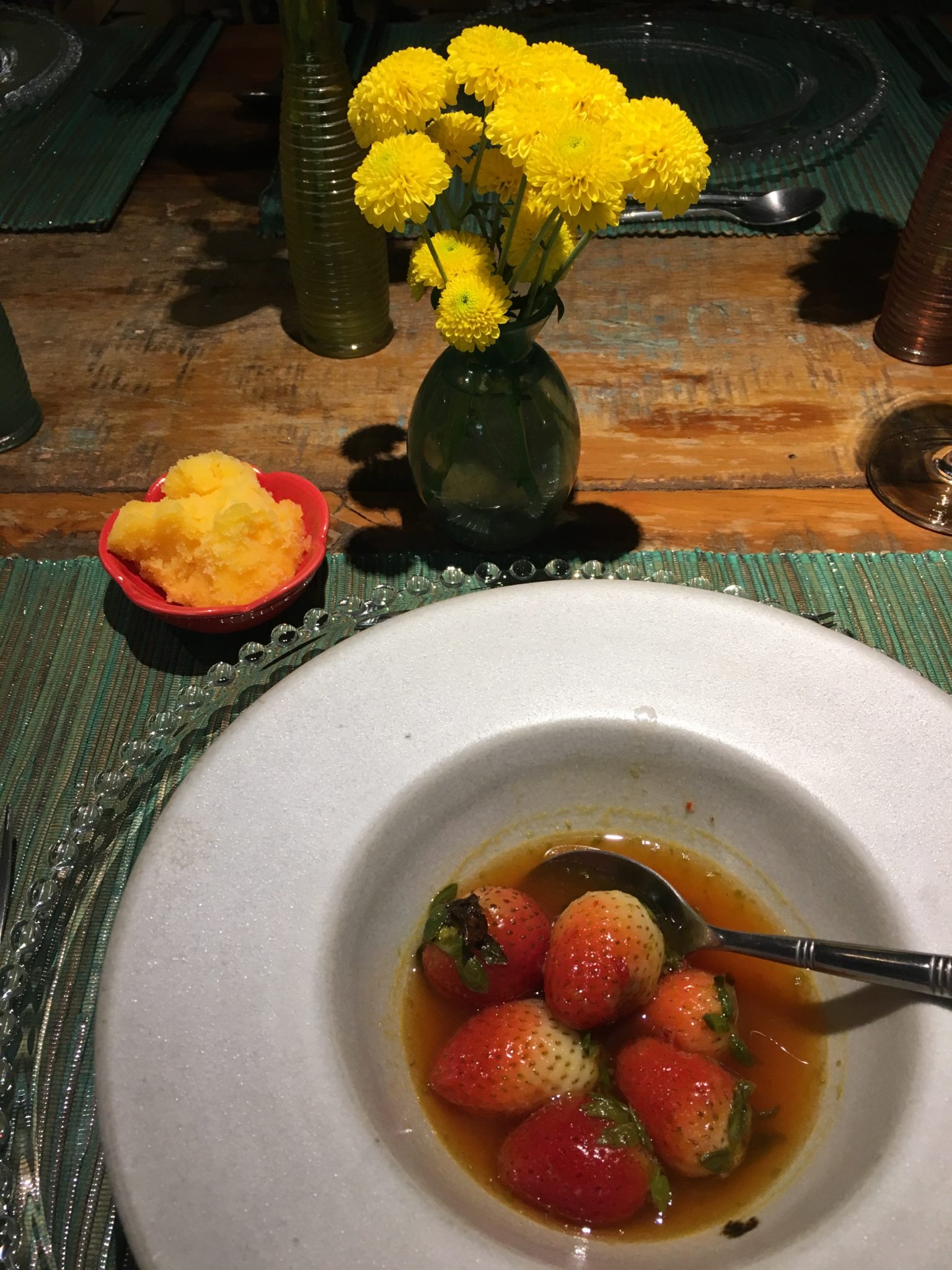 De sobremesa uma sopa de frutas vermelhas com sorbet de tangerina. Tudo muito delicado e requintado, pois era uma sugestão de cardápio para o Dia dos Namorados que já está chegando, né?