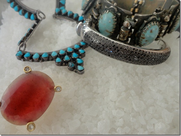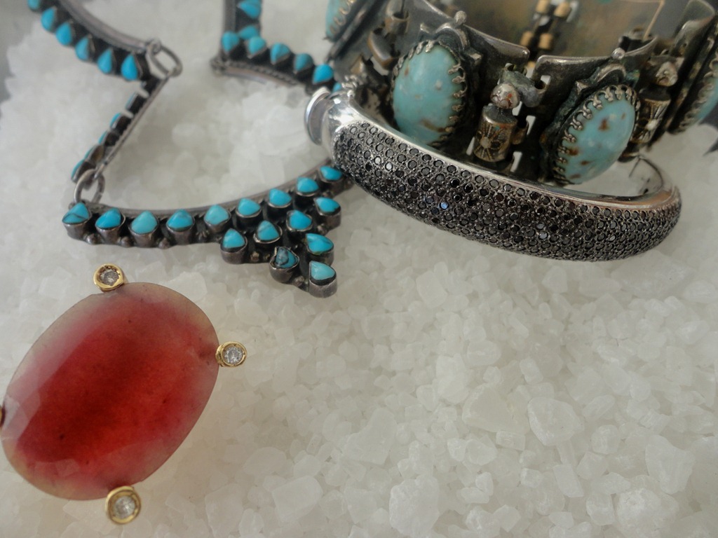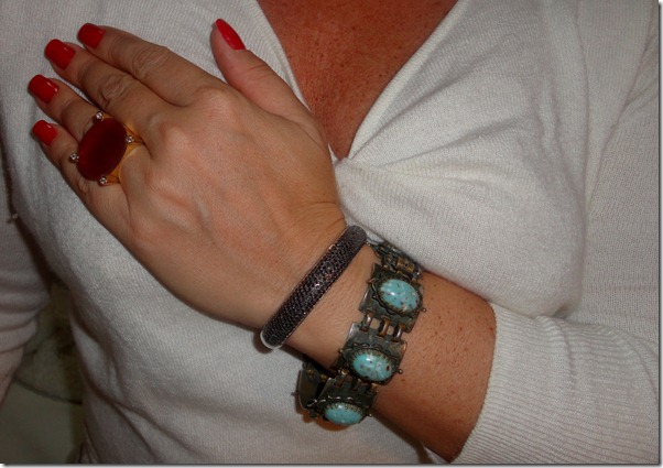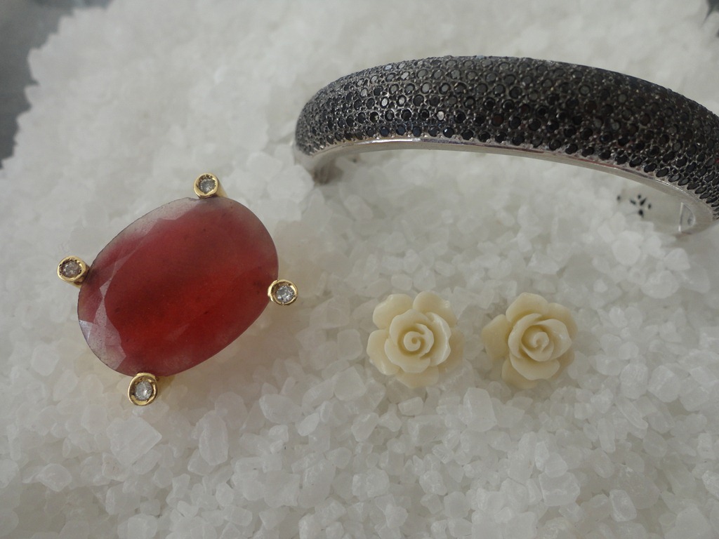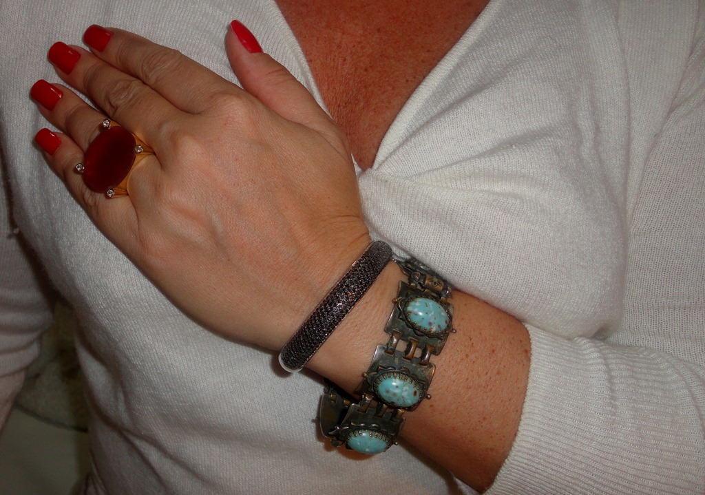 Esse bracelete de brilhantes negros é uma peça super versátil , pois funciona bem em festas (inclusive junto com outros braceletes ), e também em propostas casuais. Por causa do ródio negro nos brilhantes, ele não “ grita “ e pode ser , inclusive misturado com prata (como no colar e pulseira da foto) .E o anel em quartzo vermelho dá o toque de cor!