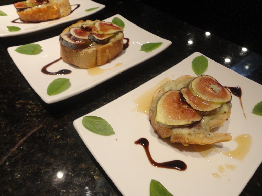 Passe manteiga nos dois lados das fatias de pão italiano e coloque por cima uma mistura feita simplesmente amassando gorgonzola com um pouco de creme de leite fresco. Por cima desse creme, coloque fatias finas de figos fresco e leve ao forno para gratinar. Ao servir, decore com caramelo balsâmico , folhas de manjericão e jogue mel trufado por cima dos figos. Fica ótimo também com um pouco de nozes carameladas ao redor.