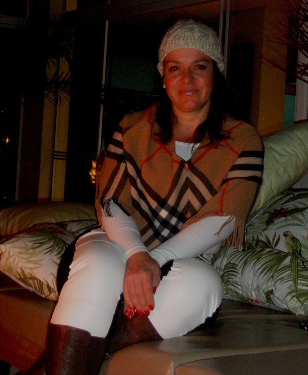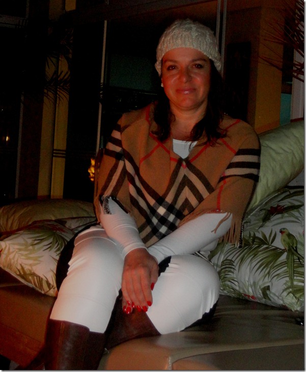 E pensei que essa calça bicolor da OBA (Rua Curitiba,2060), ficaria legal com o poncho BURBERRY e com a cashmere CALVIN KLEIN. Botas café FEGATA e JÓIAS PATRICIA DIAS.