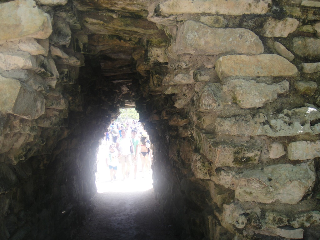 As grossas muralhas, de 6 m de espessura, formando um retângulo de 380 m por 165 m diante do mar, protegiam o chamado centro cerimonial de Tulum, área reservada para atividades da elite da sociedade, como governantes e religiosos. E você entra por esse buraco no meio da muralha para o impressionante cenário que verá pela frente.