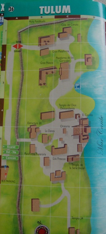 A complexidade das edificações é menor e menos impressionante do que na poderosa Chichen Itza, mas sua localização perto das falésias do litoral a torna uma das ruínas mais cênicas de Yucatan.O complexo é rodeado por um muro (a palavra Tulum significa muro) e é um conjunto de templos e palácios construídos por volta de 1400, resquícios do final da civilização maia, povo que dominou a península de Yucatán por sete séculos. A entrada para o parque custa US$ 10 . Procure visitar as ruínas pela manhã, de preferência no primeiro horário que vc conseguir (a partir 8h), pois o sol ainda está suportável. Fui às 12:30 e quase morri de tanto calor. Gostaria até de ter aproveitado mais, mas estava um sol escaldante ! A gente perde até um pouco da graça …